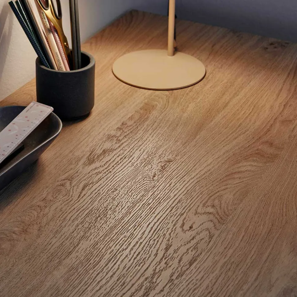Der Schreibtisch „Ristina“ wird aus hochwertigem Holzwerkstoff gefertigt, dessen Oberflächen mit einer 3D Holzoptik und Synchronporen veredelt sind. Diese Technik sorgt für einen authentischen Natur-Holzlook, der den Charme echten Holzes perfekt einfängt. Die extra starke Tischplatte und Deckplatte garantieren Langlebigkeit und Stabilität, während die dezente Gestaltung der Griffleisten ein harmonisches Gesamtbild erzeugt.