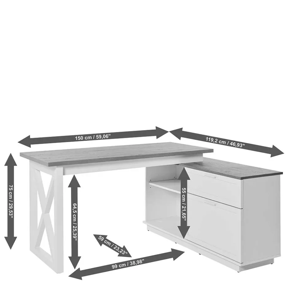 Die innovative Winkelform ermöglicht eine platzsparende Anordnung, perfekt für kleinere Räume oder Ecken. Zudem können Sie den Schreibtisch flexibel seitenverkehrt aufstellen, was Ihnen maximale Freiheit bei der Raumgestaltung gibt.