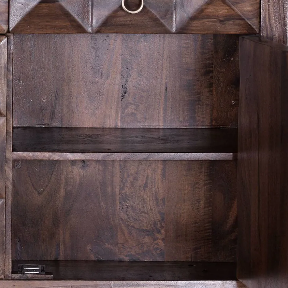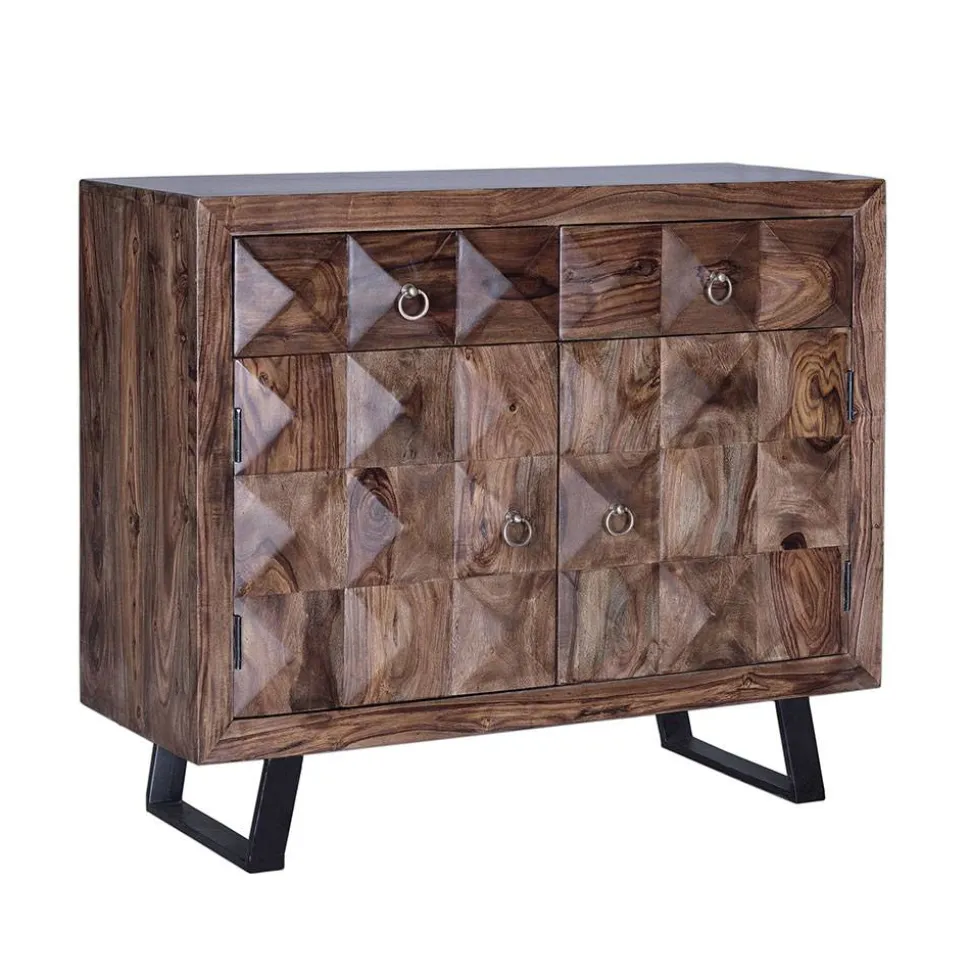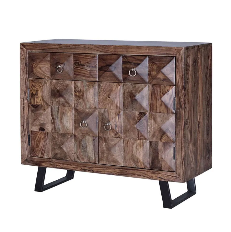 Die Design Kombi-Kommode „Christoma“ überzeugt nicht nur optisch, sondern auch durch die sorgfältige Auswahl der Materialien. Das massive Rosenholz steht für Robustheit und Beständigkeit, während die runden Metall-Ringgriffe in silberner Optik praktische und dekorative Details setzen. Das Gestell aus rustikalem Metall mit bewusst eingesetzten Gebrauchsspuren sorgt für einen charmanten Kontrast und rundet das Gesamtbild harmonisch ab. Innen bietet ein Einlegeboden zusätzlichen Stauraum und Flexibilität bei der Organisation.