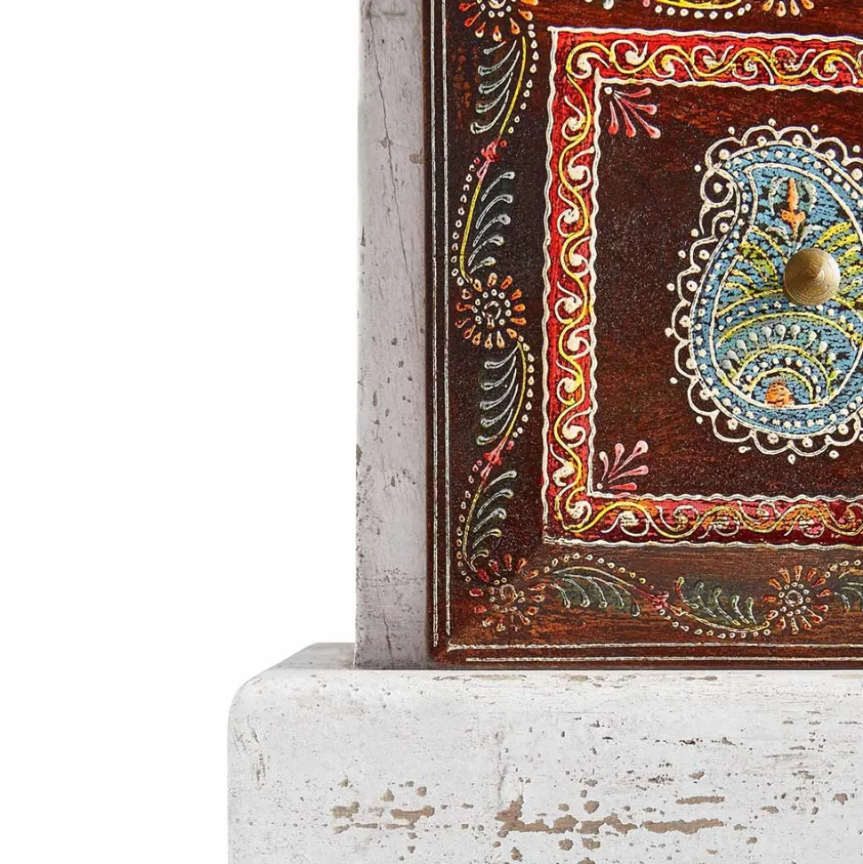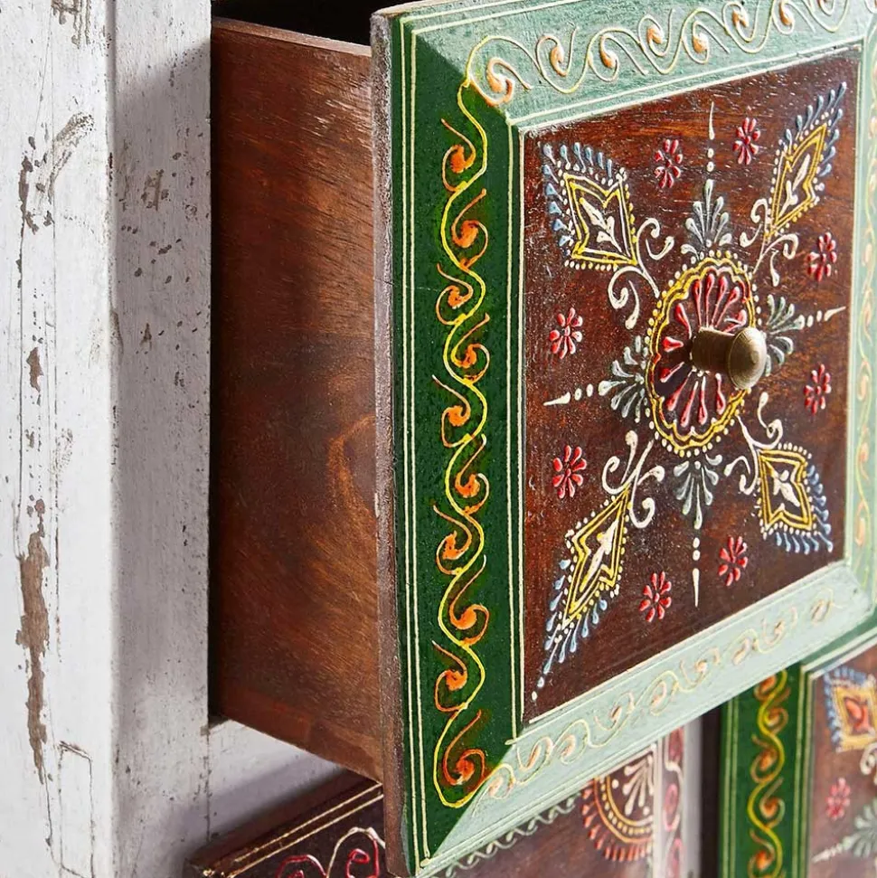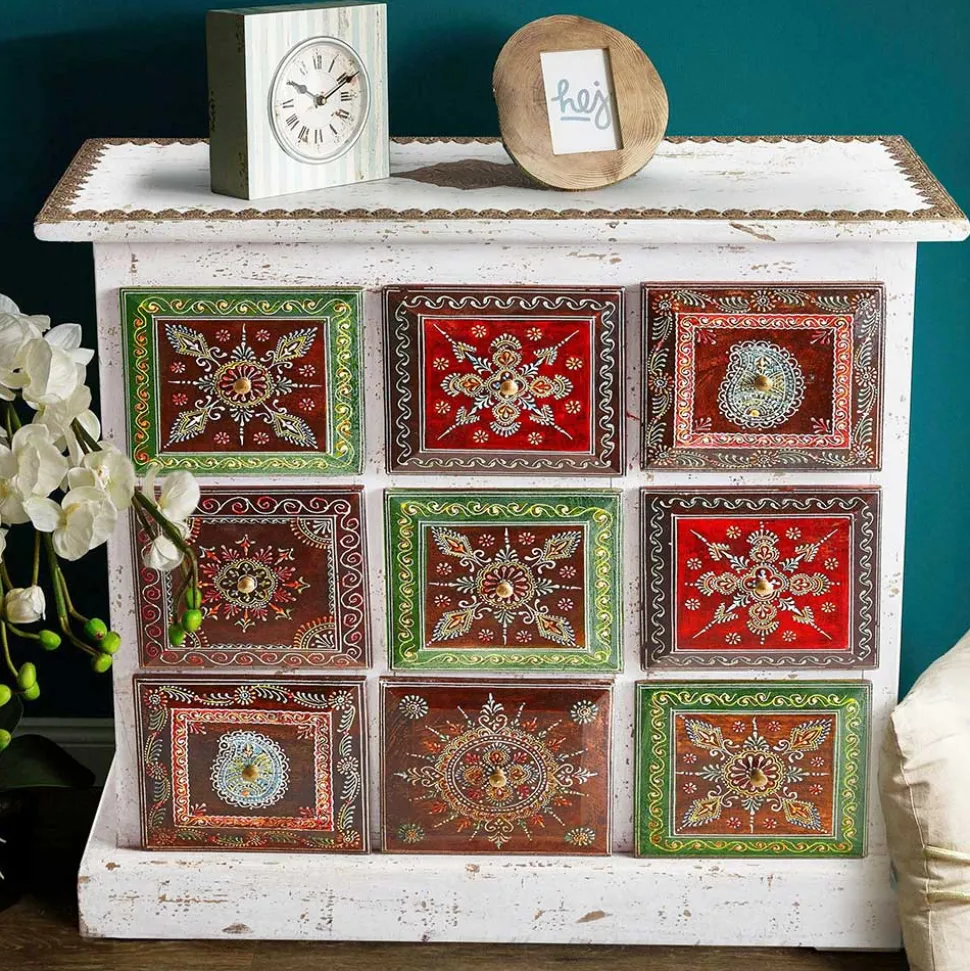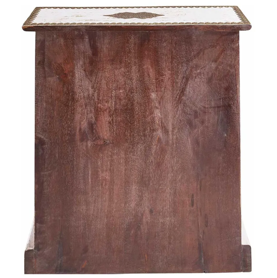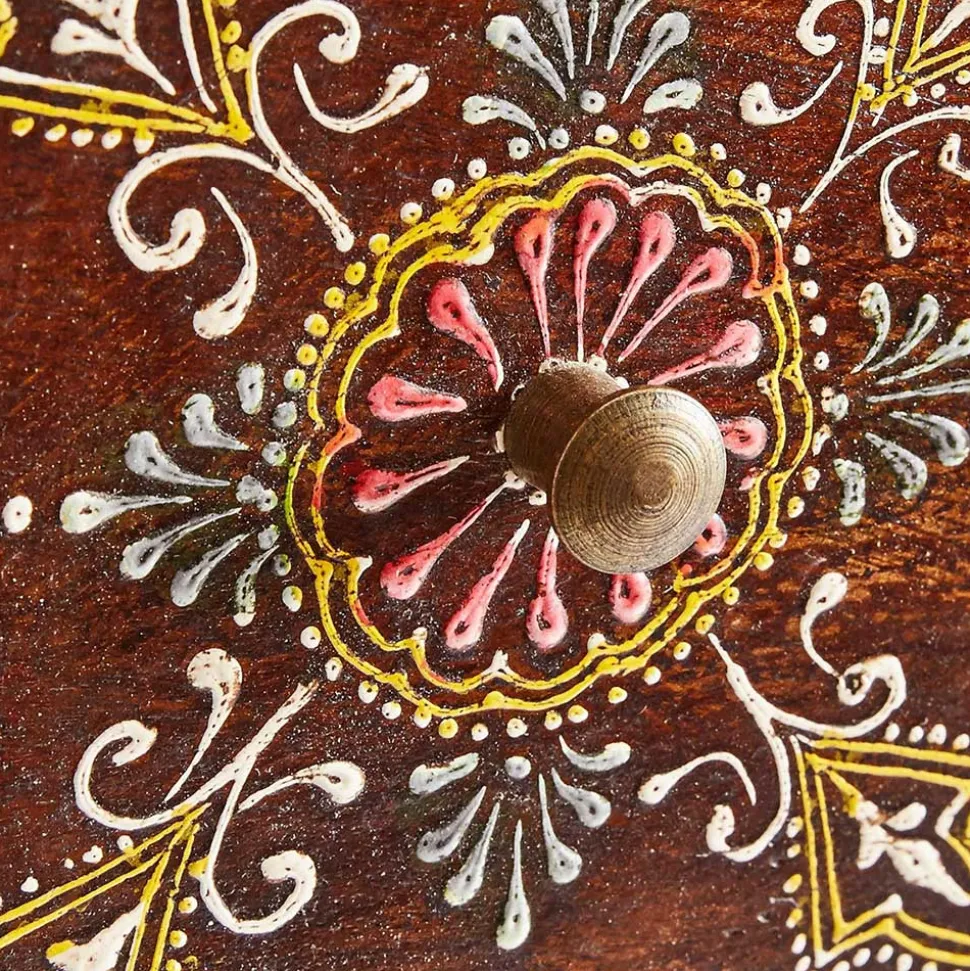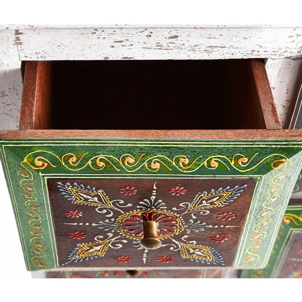 Diese Kommode wurde aus massivem Mangobaumholz gefertigt, was nicht nur für eine robuste Qualität, sondern auch für eine natürliche Ausstrahlung sorgt. Jedes Stück ist handgearbeitet und -bemalt, wodurch es zu einem einzigartigen Kunstwerk wird. Die Oberplatte ist mit einer effektvollen Metallverzierung gestaltet, die das orientalische Flair unterstreicht.