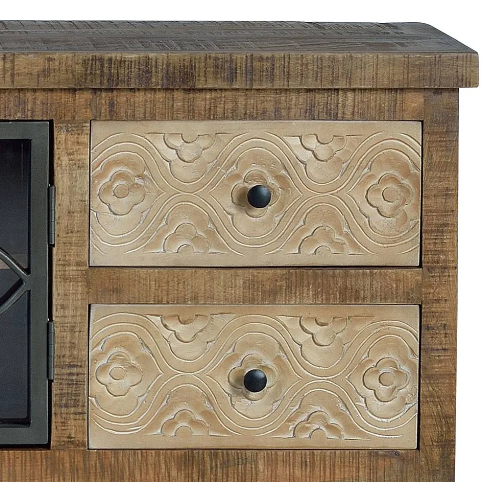 Das Lowboard beeindruckt nicht nur durch sein Design, sondern auch durch seine Funktionalität. Mit vier geräumigen Schubladen – je zwei auf der linken und rechten Seite – bietet es viel Platz für Ihre Utensilien. Die Schubladenfronten sind mit aufwendigen Schnitzereien verziert, die das Möbelstück zu einem echten Blickfang machen. In der Mitte befinden sich zwei Glastüren mit Metallrahmen und dekorativen Ornamenten. Dahinter verbirgt sich ein Einlegeboden, der zusätzlichen Stauraum für Bücher, Geschirr oder Dekorationsobjekte schafft. Die Kombination aus Stangengriffen an den Türen und Knopfgriffen an den Schubladen macht die Handhabung besonders komfortabel.