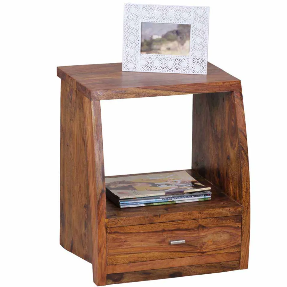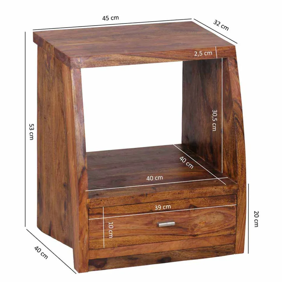 Gefertigt aus massivem Sheeshamholz bietet die Nachtkonsole nicht nur optische Qualität, sondern überzeugt auch mit langlebiger Robustheit. Sheesham, auch bekannt als indisches Rosenholz, gehört zu den härtesten und widerstandsfähigsten Hölzern weltweit. Es weist eine ausgeprägte Maserung auf, die jedem Möbelstück ein einzigartiges Erscheinungsbild verleiht. Zusätzlich ist das Holz besonders pflegeleicht, resistent gegenüber Feuchtigkeit und Verformung – eine perfekte Wahl für Möbel, die täglich genutzt werden.