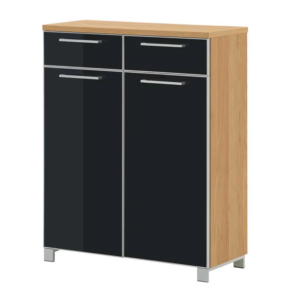 - Korpus aus Spanplatte mit Eiche Echtholz furniert und lackiert, Fronten aus Spanplatte mit Glas beschichtet, von hinten lackiert und mit umlaufendem MDF-Rahmen in Alufarben eingefasst