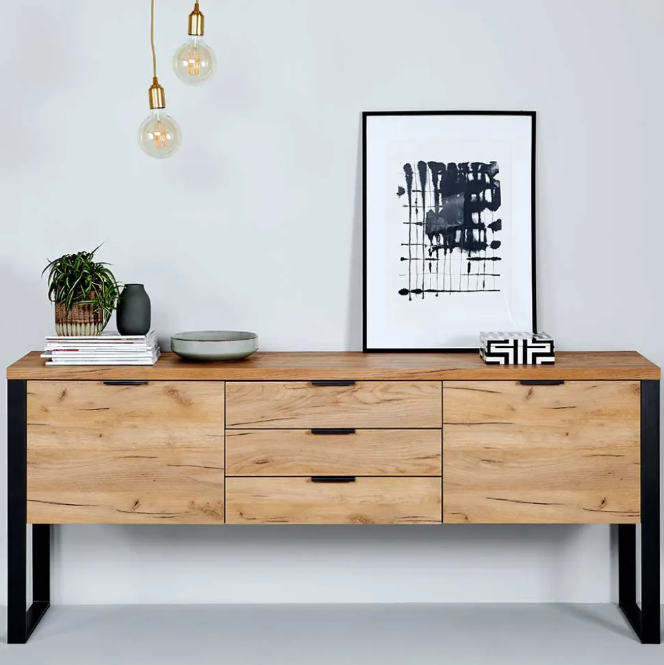 Das Sideboard „Ilvensa“ wurde aus Spanplatte und Stahl gefertigt und ist mit einer Oberfläche in 3D-Eichenholzoptik melaminbeschichtet. Das sorgt nicht nur für eine ansprechende Optik, sondern auch für eine robuste Oberfläche, die kratzfest und pflegeleicht ist. Die sorgfältige Kantenverarbeitung und die schlichten Metall-Kantengriffe an den Schubladen und Türen runden das stilvolle Design ab.