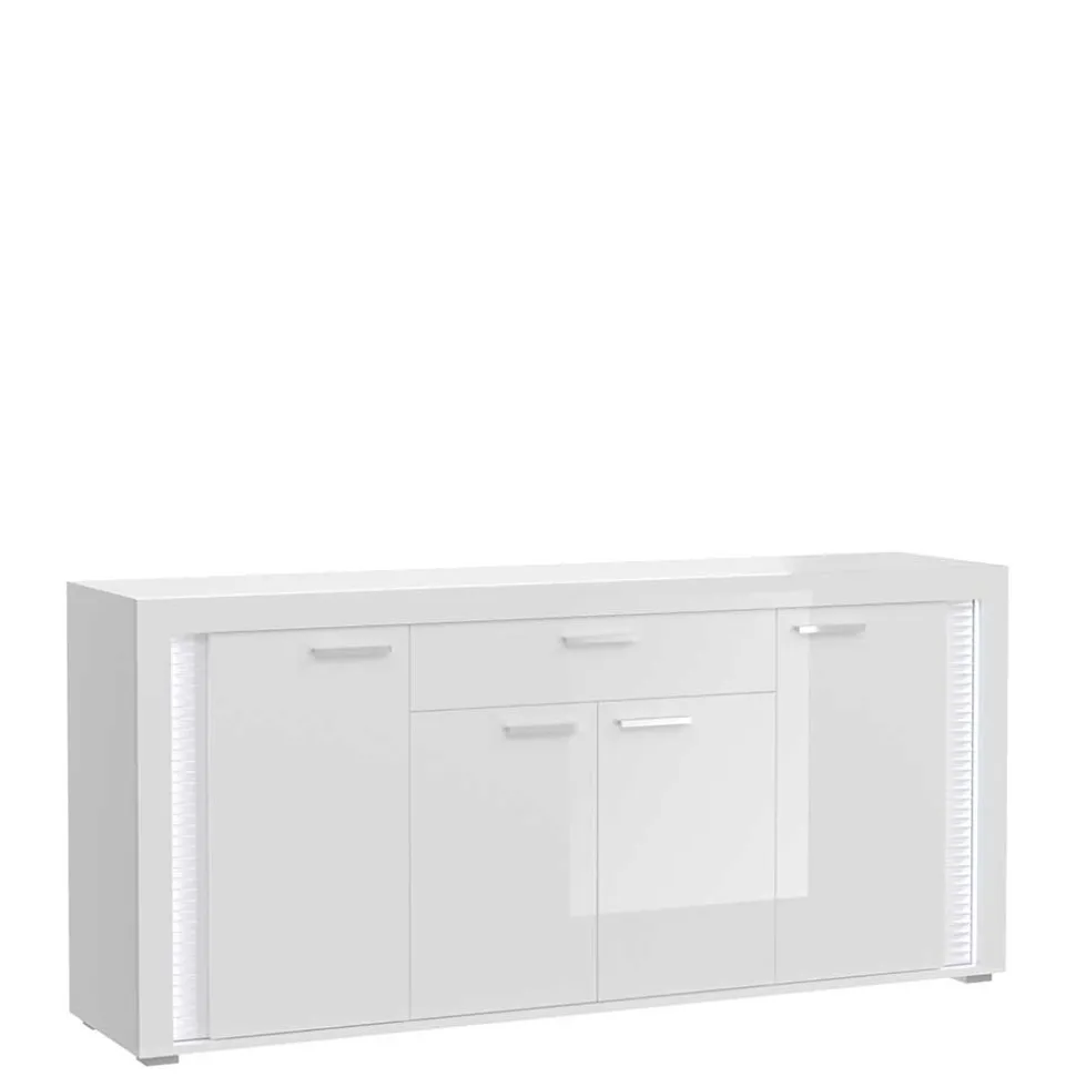 Genießen Sie die perfekte Kombination aus MDF (Front) und Spanplatte (Korpus), die zusammen eine hohe Stabilität und Langlebigkeit gewährleisten. Der Korpus, in Weiß melaminbeschichtet, zeigt sich unempfindlich gegen Kratzer und ist leicht zu reinigen, während die in Hochglanz Weiß folierte Front pure Eleganz ausstrahlt. Das seitliche elegante Rillendekor und die tiefgezogenen Kanten verleihen dem Sideboard eine edle Note und unterstreichen das exquisite Design.