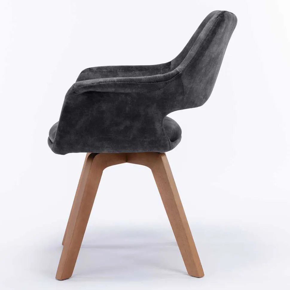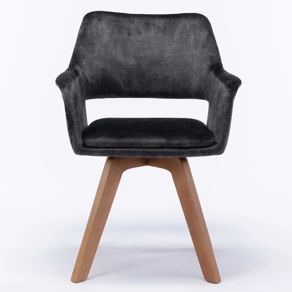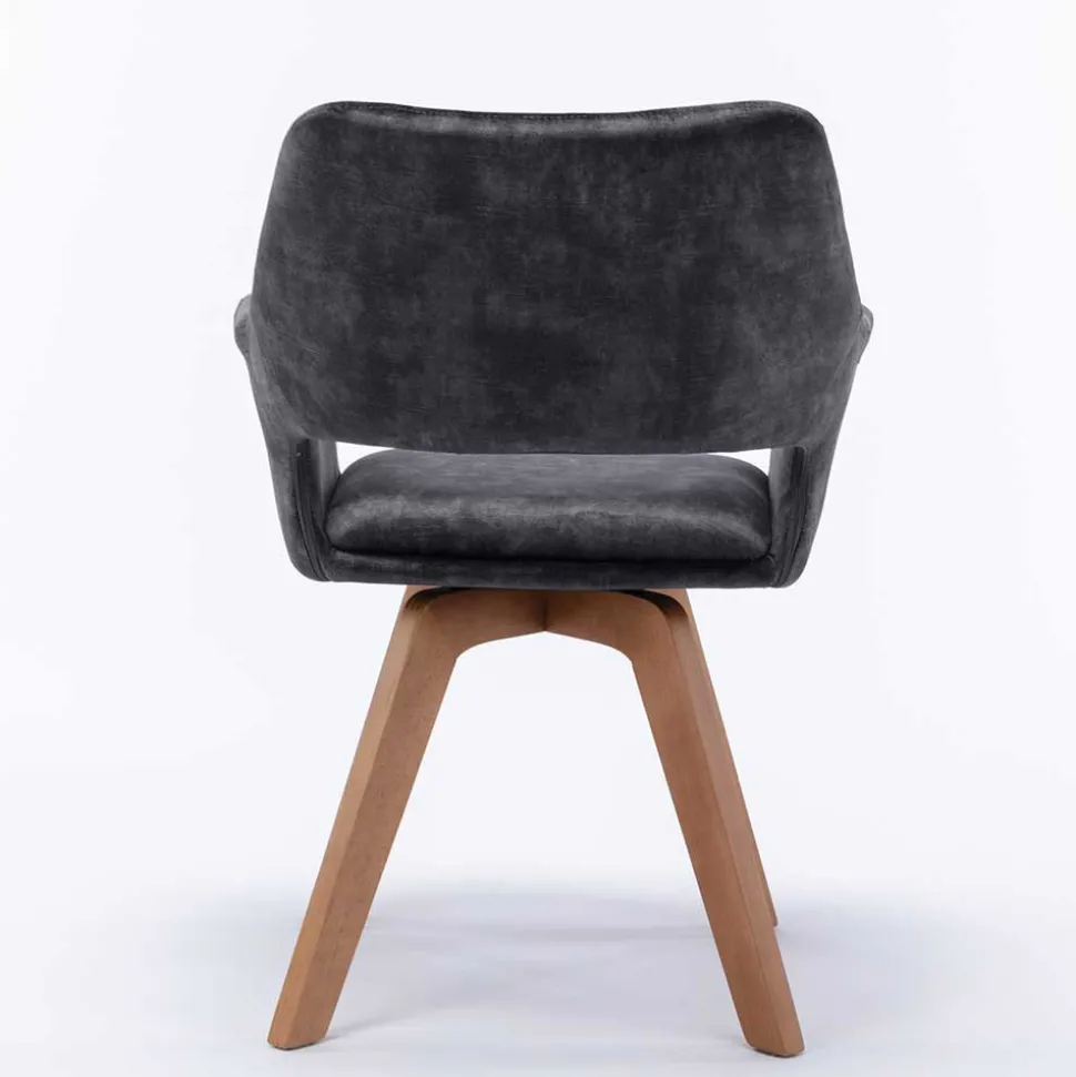 Die 360-Grad-Drehfunktion des Vierfußgestells aus massivem Holz in Eichefarben verleiht dem Stuhl eine spielerische Note. Die ca. 38 cm hohe Rückenlehne mit einem dekorativen Ausschnitt setzt zusätzliche Akzente und verleiht dem „Tiamo“ seinen einzigartigen Charme. Die Armlehnen bieten mit einer Unterschubhöhe von ca. 62,5 cm zusätzlichen Komfort.