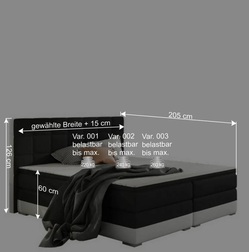 - Max. Belastbarkeit: 140×200 cm: 220 kg, 160×200 cm: 240 kg, 180×200 cm: 260 kg
