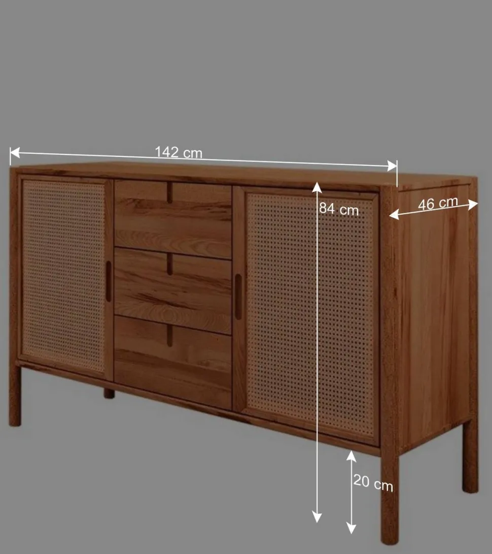 Mit einer Breite von 142 cm, einer Höhe von 84 cm und einer Tiefe von 46 cm bietet das Sideboard „Indrya“ ausreichend Stauraum für Ihre Utensilien. Hinter den zwei Türen, die mit gedämpften Metallbeschlägen ausgestattet sind, befinden sich jeweils ein Einlegeboden, der für eine gute Übersichtlichkeit sorgt. Die Türfronten sind im Stil des Wiener Geflechts gefertigt, eine traditionelle Handwerkstechnik, die dem Möbelstück eine besondere Note verleiht. Drei geräumige Schubladen mit Metallauszug und Soft-Close Funktion bieten zusätzlichen Stauraum und unterstreichen die hohe Funktionalität dieses Möbelstücks.
