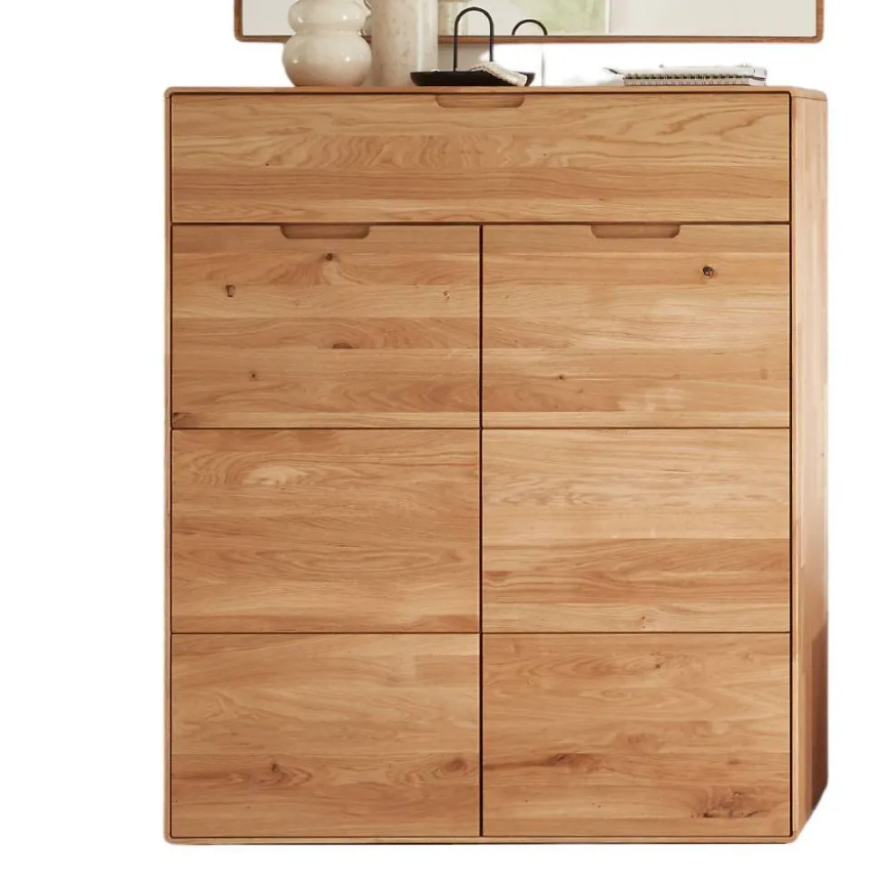 Gefertigt aus hochwertiger Wildeiche Massivholz, ergänzt durch Metall und Spiegelglas, bietet das Dieleneinrichtung Möbelset „Darcona“ eine gelungene Materialkomposition. Die Holzoberflächen sind natürlich geölt und unterstreichen die lebendige Maserung des Eichenholzes. Risse und Wölbungen sind naturbedingt und machen jedes Möbelstück zu einem Unikat – ein Zeichen echter Handwerkskunst. Ein Verzug von 0,6–1,2 % ist bei diesem Naturmaterial üblich und stellt keinen Reklamationsgrund dar.