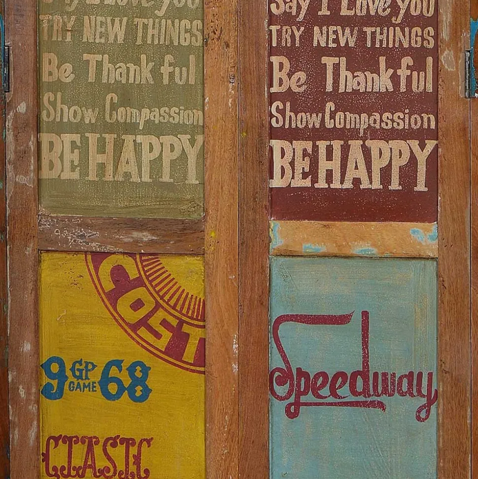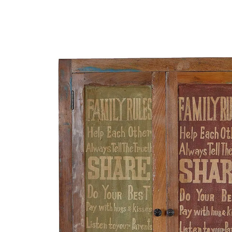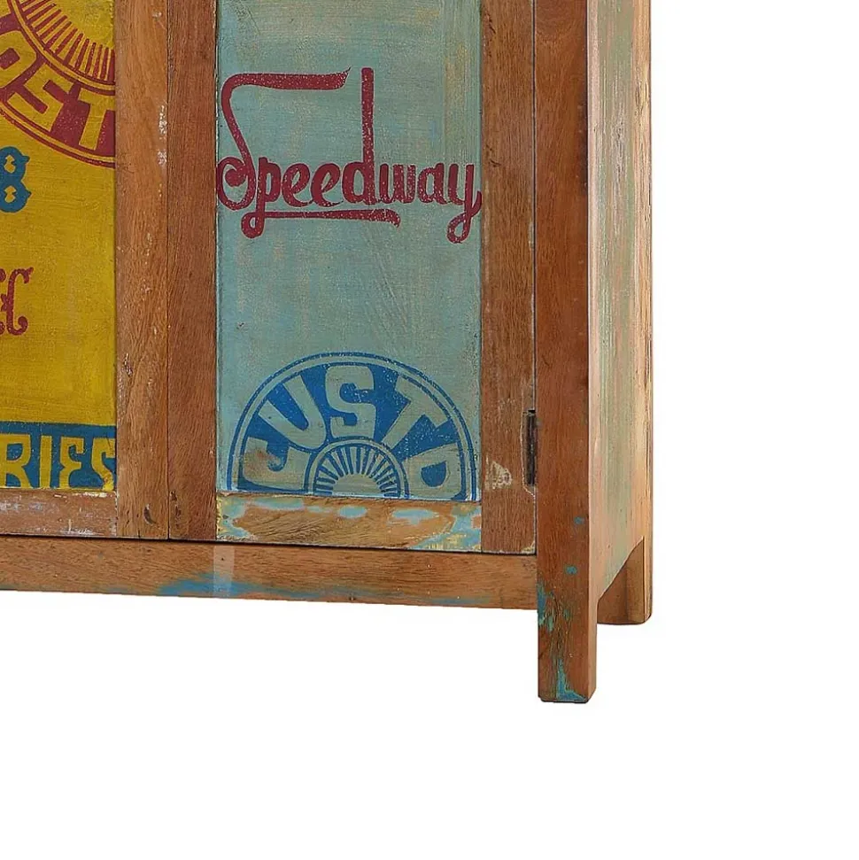 Kunstvolle Details, die begeistern Neben seiner beeindruckenden Haltbarkeit und Umweltfreundlichkeit besticht der Schrank „Creek“ durch seine kunstvollen Fronten. Die lackierte, pflegeleichte Oberfläche zeigt originelle Motive mit Buchstaben und Zahlen, inspiriert von alten Werbungen. Diese detailreichen Verzierungen machen den Schrank zu einem unverwechselbaren Blickfang in Ihrem Dielen- oder Wohnbereich.