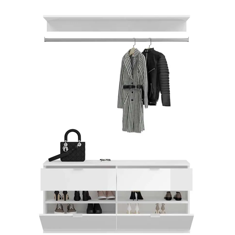 Die Hutablage (121x14x34 cm) und die dazugehörige Kleiderstange mit einer Stärke von 3 cm bieten dir zusätzlichen Stauraum für Hüte, Schals oder Jacken. Die hochwertige Metallstange verleiht dem Möbelstück eine moderne Note und ist stabil genug, um auch schwere Mäntel problemlos zu tragen.