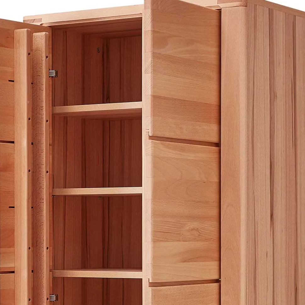 Der Dielenschrank ist ein wahres Multitalent mit zwei Türen, gefertigt aus Massivholz Kernbuche und Spanplatte, ebenfalls in kernbuchenfarbener Optik. Mit acht Einlegeböden und dämpfenden Türen ausgestattet, bietet er genügend Platz für eine optimale Organisation Ihres Eingangsbereichs.