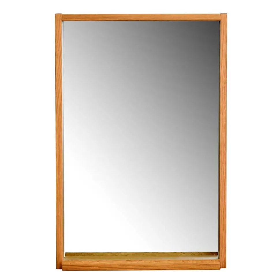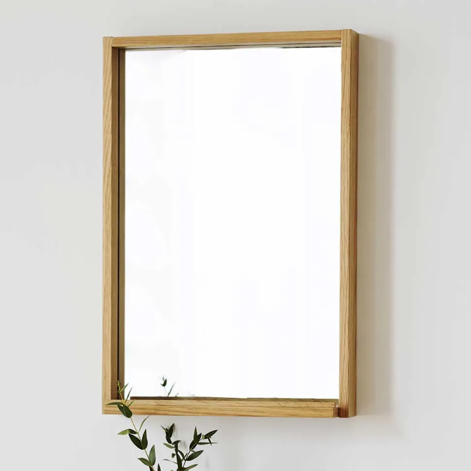 Der Spiegel besteht aus hochwertigem Spiegelglas und MDF. Sein Rahmen ist mit Eiche Echtholzfurnier veredelt und sorgt für eine natürliche Optik. Die Holzoberflächen sind lackiert, was dem Möbelstück eine besonders edle Note verleiht. Eine kleine Ablage am unteren Rand aus Holz bietet Platz für kleine Gegenstände und ist bis zu 1 kg belastbar.