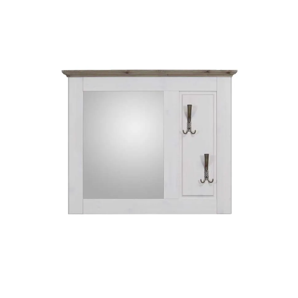 Mit einer Breite von 105 cm, einer Höhe von 87 cm und einer geringen Tiefe von nur 6 cm ist die Spiegelgarderobe Yoan perfekt für schmale Flure und kompakte Dielen geeignet. Der breite Rahmen mit feinen Fräsungen unterstreicht den Landhausstil und sorgt für ein harmonisches Gesamtbild. Links befindet sich ein großzügiges Spiegelelement, das nicht nur optisch Weite schafft, sondern Ihnen auch den letzten Blick auf Ihr Outfit vor dem Verlassen des Hauses ermöglicht. Rechts ergänzen zwei hochwertige Metall-Doppelhaken die Funktionalität der Garderobe, sodass Jacken, Taschen oder Schals stets griffbereit hängen.