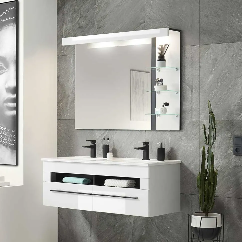 - Gefertigt aus MDF (Front), Spiegelglas und Spanplatte (Korpus)