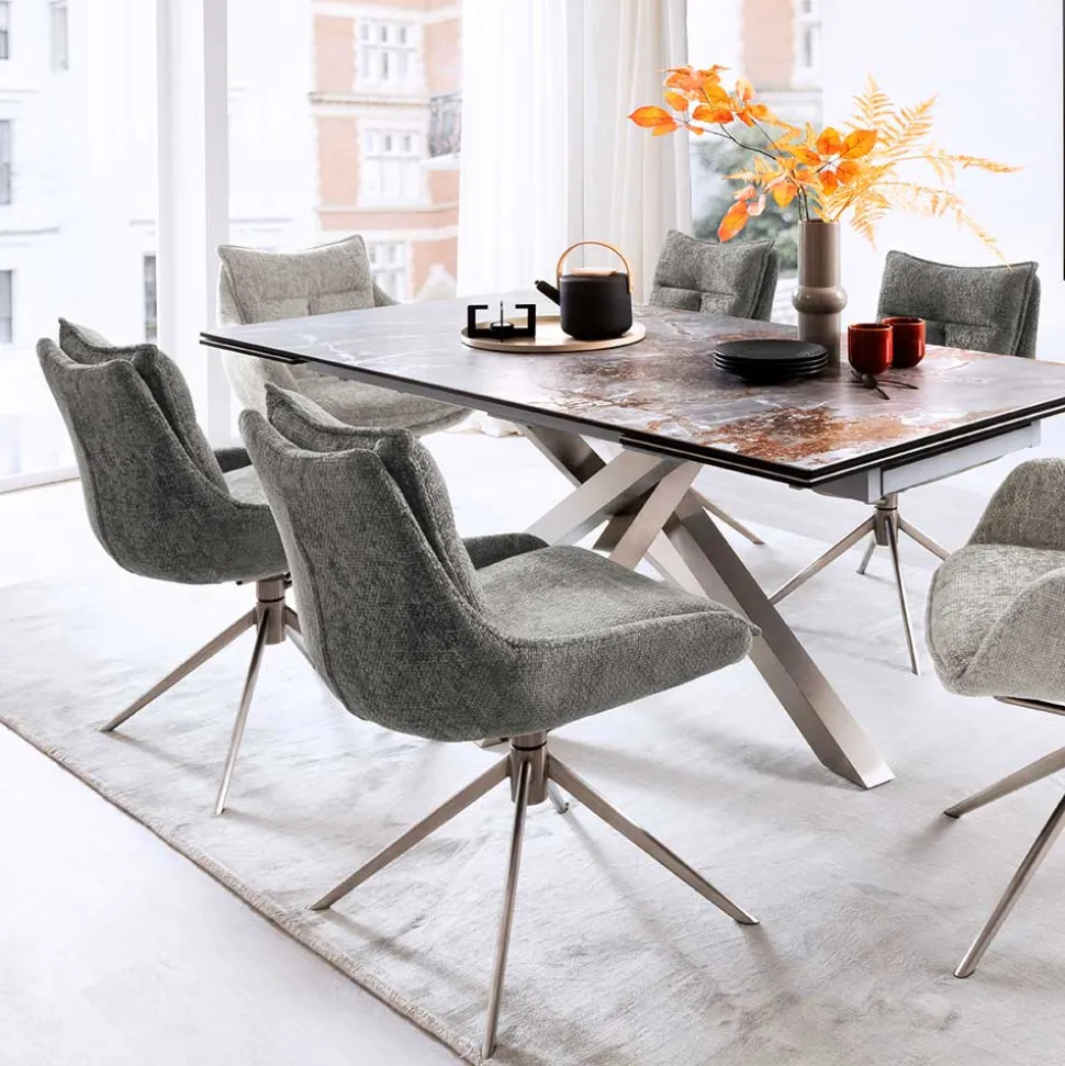 Das gebürstete Edelstahlgestell mit seinen konisch zulaufenden Beinen verleiht dem „Faviconda“ nicht nur einen modernen Look, sondern bietet auch Stabilität und Langlebigkeit. Der Schwingeffekt der Beine sorgt für ein leicht federndes Sitzgefühl, das zusätzlichen Komfort bietet. Besonders praktisch ist die 360-Grad-Drehfunktion, die Ihnen maximale Bewegungsfreiheit ermöglicht. Dank der integrierten Nivellierung bleibt der Stuhl auch auf unebenen Böden stabil und sicher.