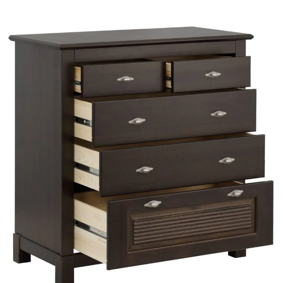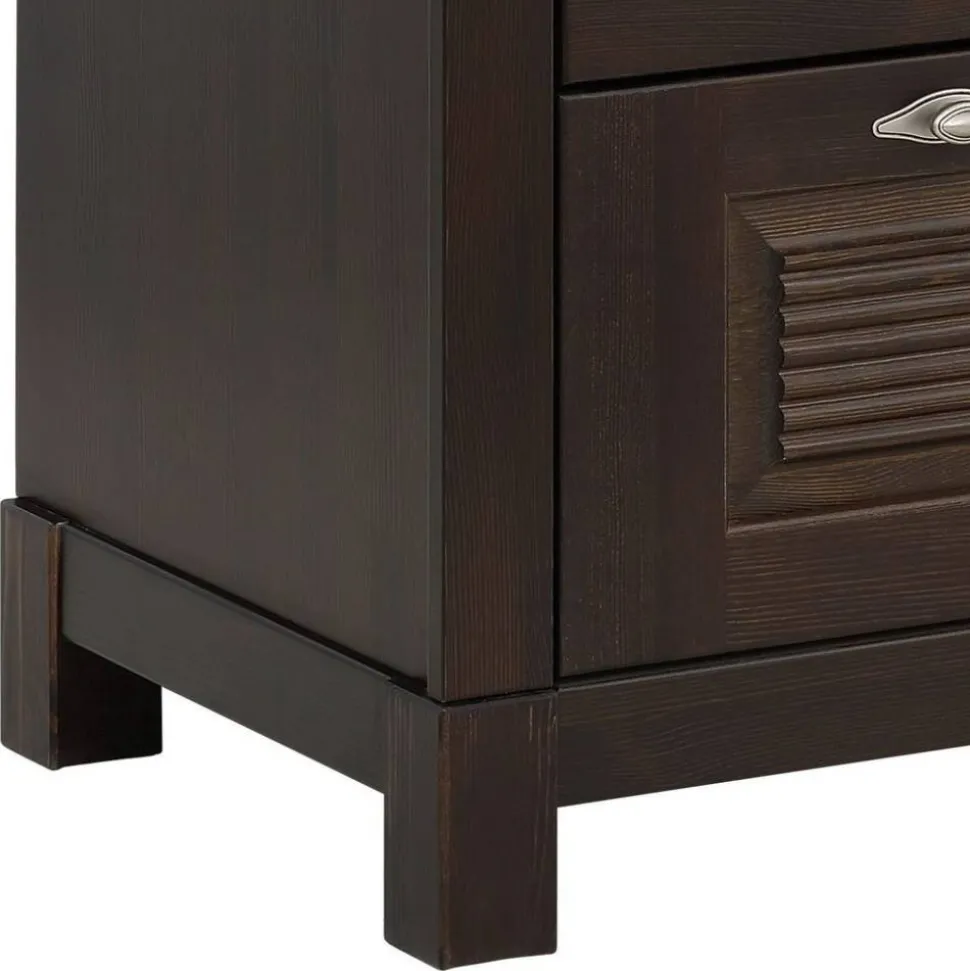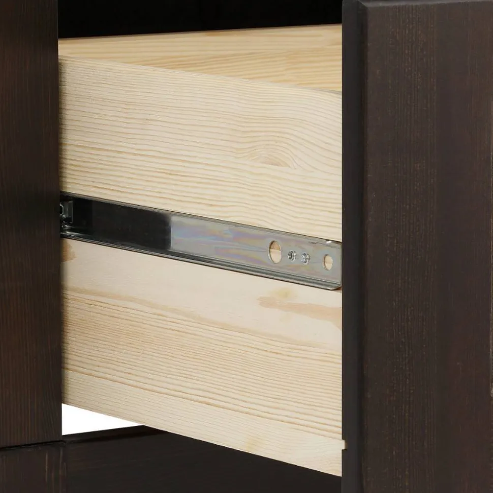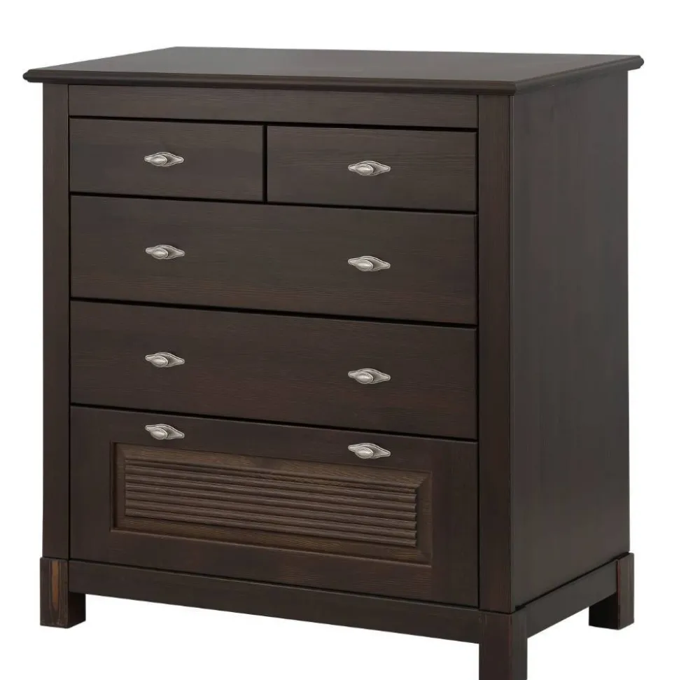 Die dunkelbraune Lackierung verleiht der Kommode eine elegante Tiefe, während die durchscheinende Holzmaserung für eine spürbare Natürlichkeit sorgt. Dieses Wechselspiel zwischen Farbe und Struktur macht „Sikulav“ zu einem Blickfang in jedem Raum – edel, aber nicht aufdringlich. Es ist ein Möbelstück, das nicht nur optisch beeindruckt, sondern auch durch seine subtile Wärme einladend wirkt.