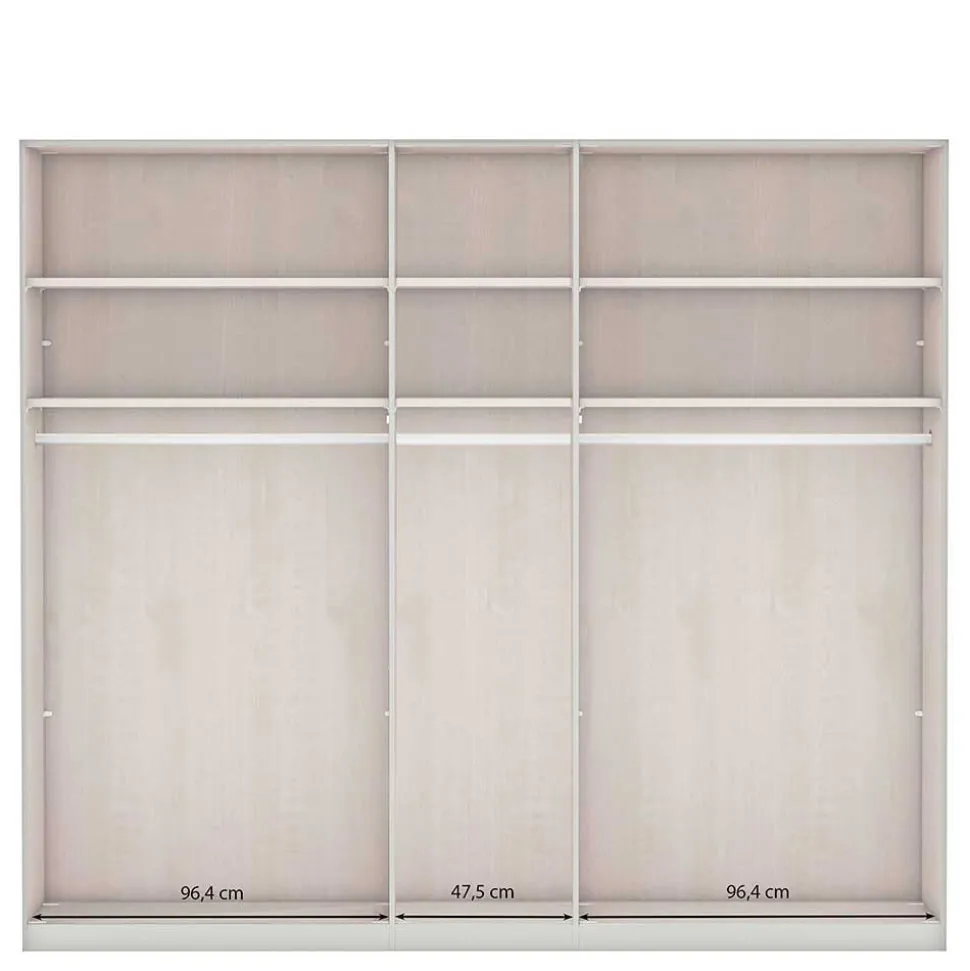 - Drei Fachelemente innen, Breite: 96,4/47,5/96,4 cm, jeweils mit zwei Einlegeböden und einer Kleiderstange ausgestattet