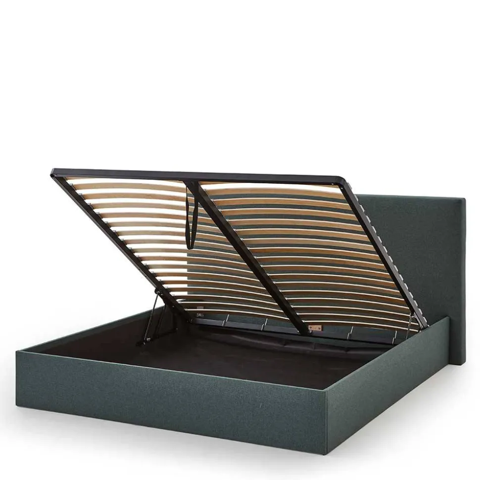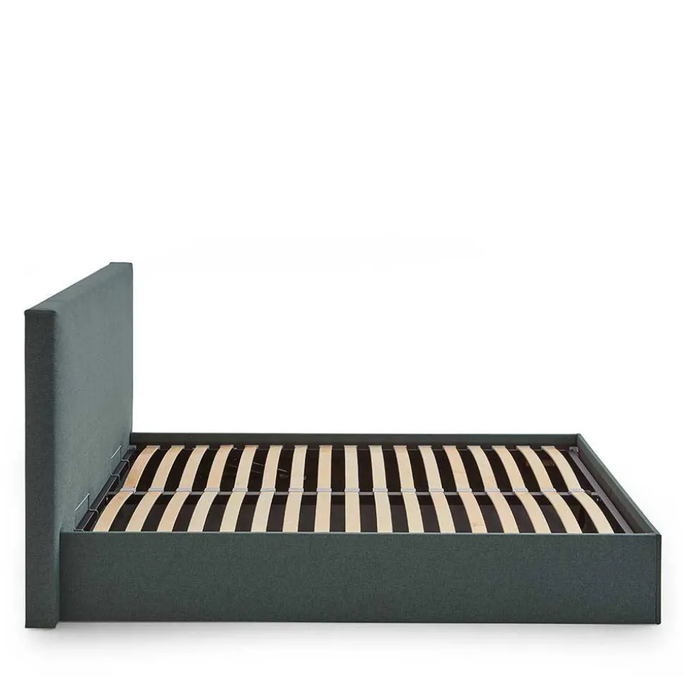 Der Bezug des Bettes besteht zu 100 % aus strapazierfähigem Polyester und beeindruckt durch seine feine Melierung. Dieser hochwertige Webstoff in Dunkelgrün ist nicht nur besonders langlebig, sondern auch äußerst pflegeleicht. Schmutz und Staub haben dank der pflegeleichten Oberfläche kaum eine Chance – einfach abwischen, und das Bett sieht aus wie neu. So bleibt der edle Look des Bettes lange erhalten, ohne dass Sie viel Aufwand in die Pflege investieren müssen.