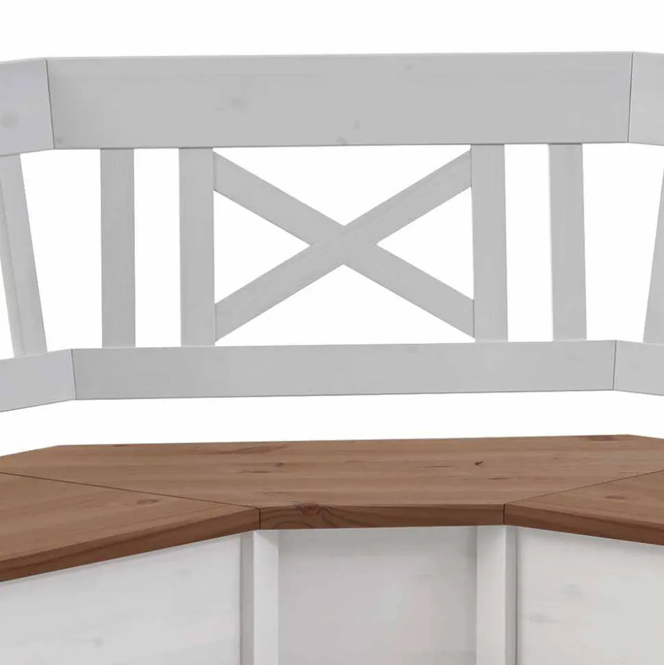 Eine harmonische Symbiose aus Weiß und Bernsteinfarben verleiht der Eckbank „Barlad“ eine beeindruckende visuelle Wirkung. Die Farbkombination schafft nicht nur einen ansprechenden Kontrast, sondern hebt auch die natürliche Schönheit des nordischen Kiefernholzes hervor. Die durchscheinende Maserung des Holzes verleiht der Bank eine lebendige und einzigartige Optik, die jeden Raum aufwertet.
