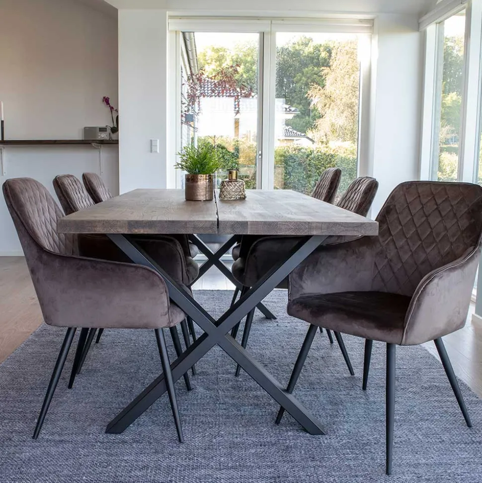 Zum siebenteiligen Möbel-Set Dicampo gehören außerdem sechs Armlehnstühle, welche mit schimmernden Bezügen aus Samt (100 % Polyester) im attraktiven Farbton Taupe bezogen sind. Die Rückenlehnen sind dekorativ mit einer Rauten-Steppung verziert. Jeder Stuhl hat vier schwarze Metallbeine, die sich nach unten hin verjüngen und für Stabilität (max. Belastbarkeit je Stuhl: 130 kg) und einen sicheren Stand sorgen. Freuen Sie sich auf eine angenehme Sitzhöhe von ca. 47 cm und eine ebenso ausfallende Sitztiefe. Die Komplett-Abmessungen eines Armlehnstuhls liegen bei 57x87x56 cm (BxHxT).