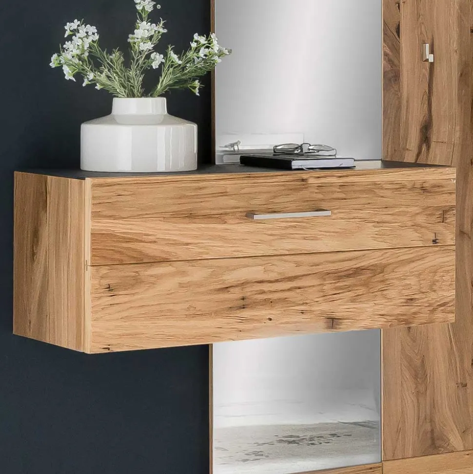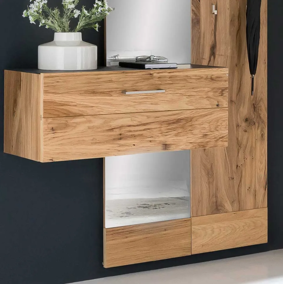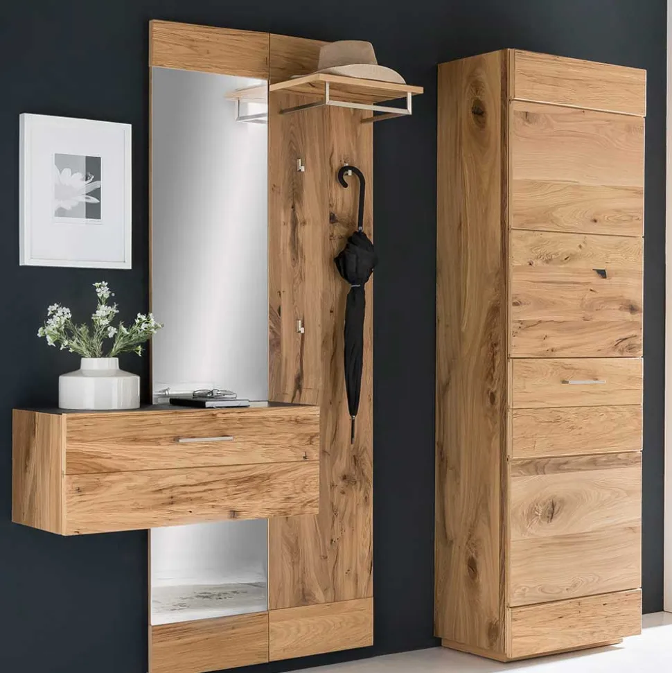 Das komplette Set besteht aus einem Garderobenpaneel, einem Garderobenschrank, einem Hängeschrank, einem kleinen sowie einem großen Wandspiegel – alle gefertigt aus robustem Schichtholz Altholzeiche. Die Oberflächen sind mit Balkeneiche furniert und lackiert, was nicht nur Schutz vor täglichen Belastungen bietet, sondern auch für einen edlen Glanz sorgt. Die Fronten, grob gebürstet und geschliffen, offenbaren eine angesagte, raue Optik mit fühlbaren Unebenheiten, die jedes Stück zu einem Unikat machen.