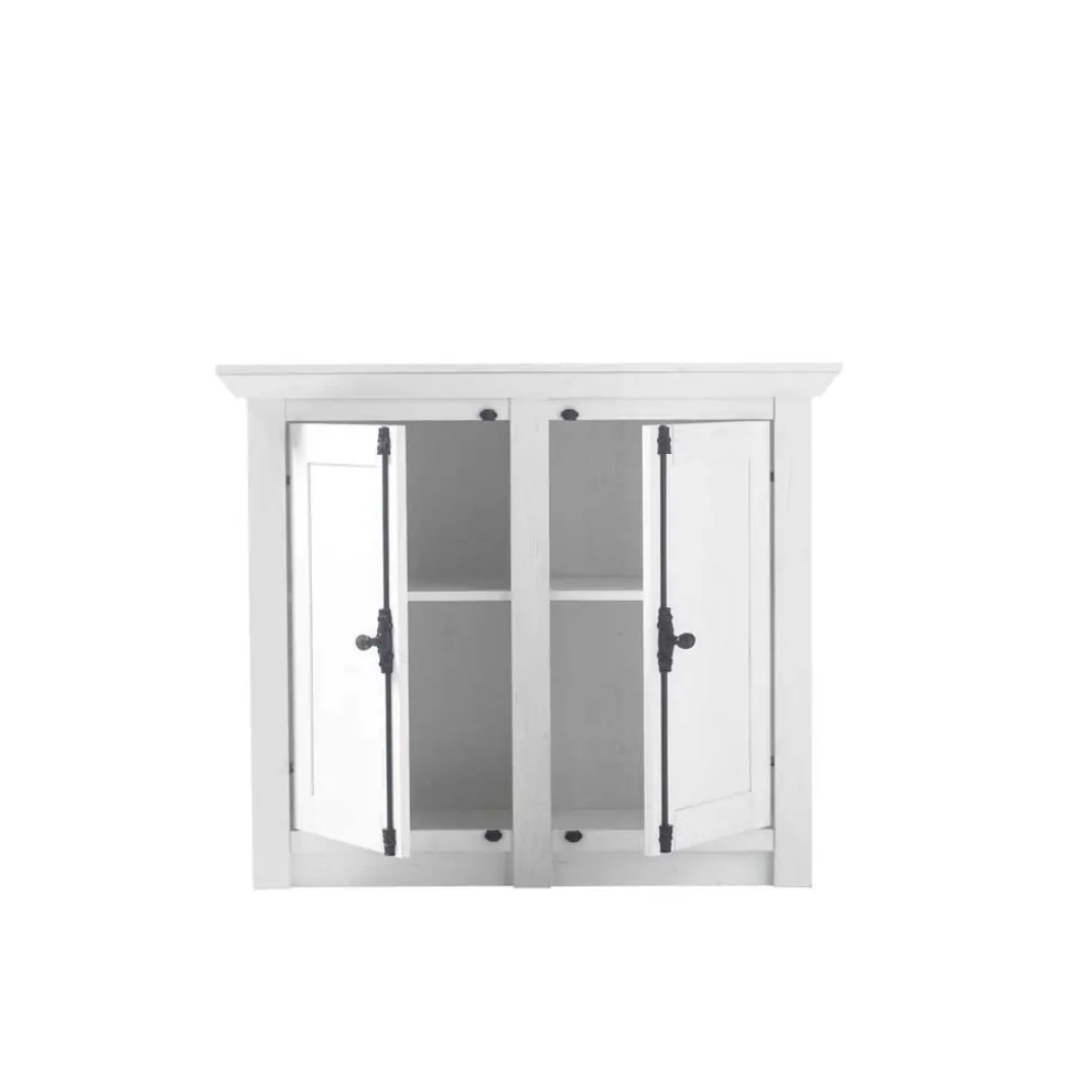 Die Schubladen sind mit soliden Metallauszügen ausgestattet, die reibungslose Bewegung und Stabilität gewährleisten. Die klassischen Knopfgriffe und rustikalen Stangengriffe aus Metall in Schwarz setzen einen optischen Kontrast und verleihen dem Set eine besondere Note.