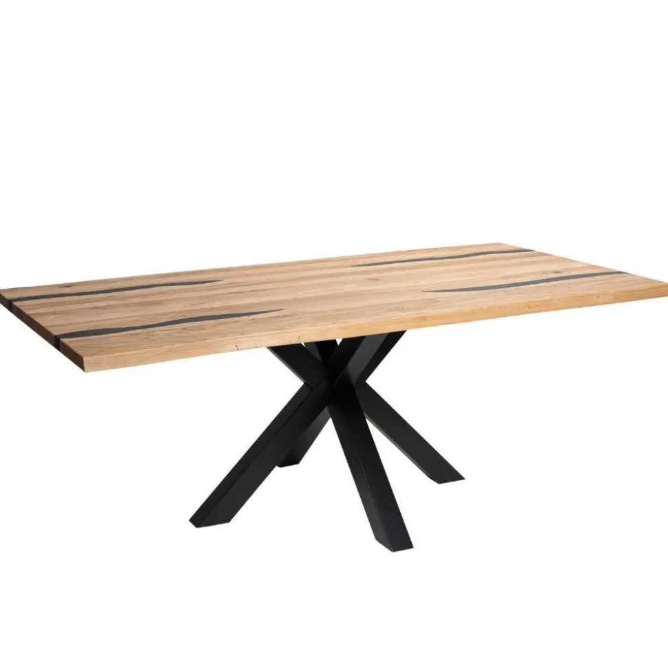 Die Tischplatte des Eiche Esszimmertischs „Slavidra“ ist 2 cm stark und auf 4 cm aufgedoppelt, was ihr Stabilität und eine hochwertige, wertige Optik verleiht. Die durchgehende Lamellenverarbeitung, die rustikal lackierte Oberfläche und die mit Kitt gespachtelten Stellen unterstreichen den natürlichen Charakter des Holzes und machen die Platte zu einem Unikat. Die langen Seiten sind mit natürlichen, unterschiedlich gewellten Baumkanten versehen, die den Tisch lebendig und unverwechselbar wirken lassen. Besonders eindrucksvoll sind die vier Epoxid-Harz-Flammen-Einlagen, jeweils zwei an jedem kurzen Ende, die kunstvoll in die Holzplatte eingearbeitet sind. Sie erzeugen raffinierte Lichteffekte und setzen den Tisch gekonnt in Szene.
