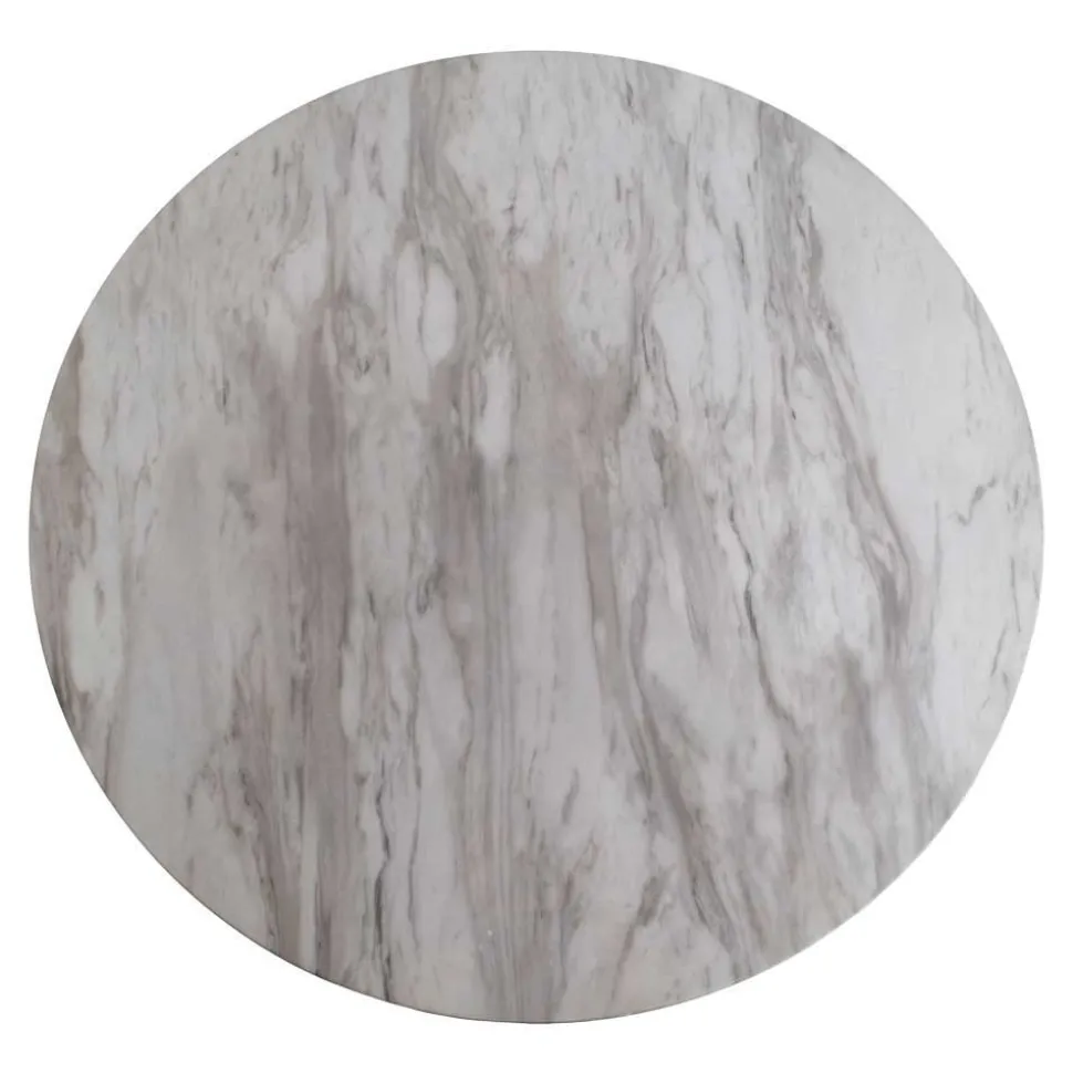 Auf höchste Qualität und durchdachte Materialwahl wurde bei der Sitzgruppe „Nathan“ größter Wert gelegt. Die runde Tischplatte besteht aus robustem MDF und wurde im sorgfältigen Folierungsverfahren mit einer hellgrau-weiß marmorierten Oberfläche veredelt. Diese Methode verleiht der Platte nicht nur eine edle Marmoroptik, sondern schützt sie auch zuverlässig vor Feuchtigkeit und Abnutzung – ideal für den täglichen Gebrauch.