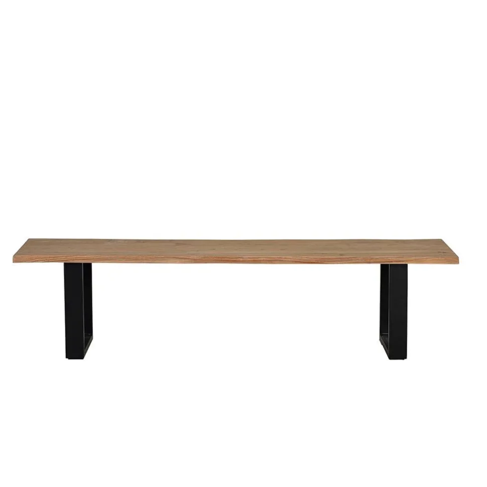 Gefertigt wird die „Calivia“ aus hochwertiger Akazie Massivholz und stabilem Metall. Das Sitzbrett überzeugt durch seine natürliche Maserung und die charakteristischen Baumkanten, die aus dem gewachsenen Stamm herausgeschnitten werden. Dadurch entsteht ein lebendiges, unverwechselbares Erscheinungsbild – jede Bank ist ein handgefertigtes Unikat. Die beiden U-Bügelbeine aus schwarzem Metall sorgen für einen sicheren, stabilen Stand und setzen einen modernen Kontrast zum warmen Holzton.