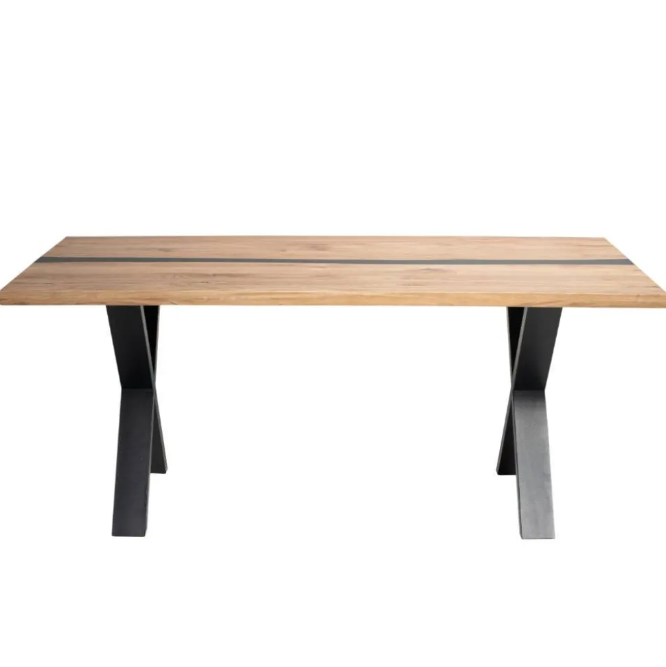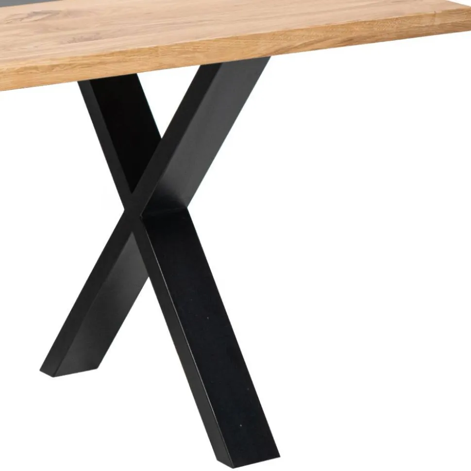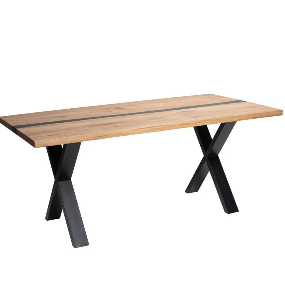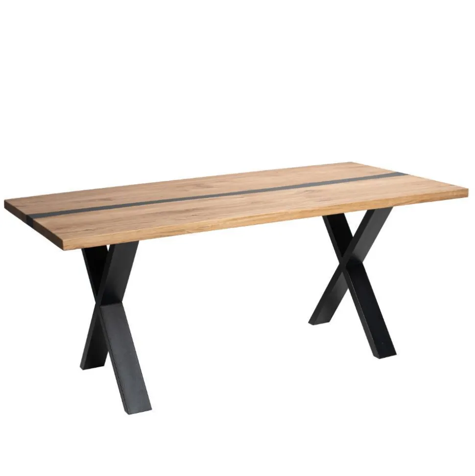 Die Tischplatte besteht aus massivem Eichenholz in durchgehender Lamellenverarbeitung. Rustikal lackiert und mit Kitt gespachtelt, zeigt sie die natürliche Maserung in ihrer ganzen Schönheit. Die Platte ist 2 cm stark und auf 4 cm aufgedoppelt, was Stabilität und Präsenz garantiert. Ein besonderes Highlight ist die mittige Epoxid-Harz-Einlage in Schwarz mit unregelmäßig verlaufenden Kanten, die jedem Tisch einen individuellen Charakter verleiht. Die X-förmigen Metallbeine in Schwarz verbinden modernes Design mit sicherem Stand und unterstreichen den kraftvollen Industrial-Charakter.