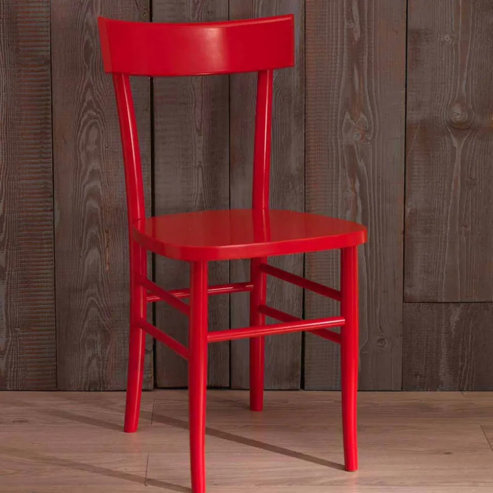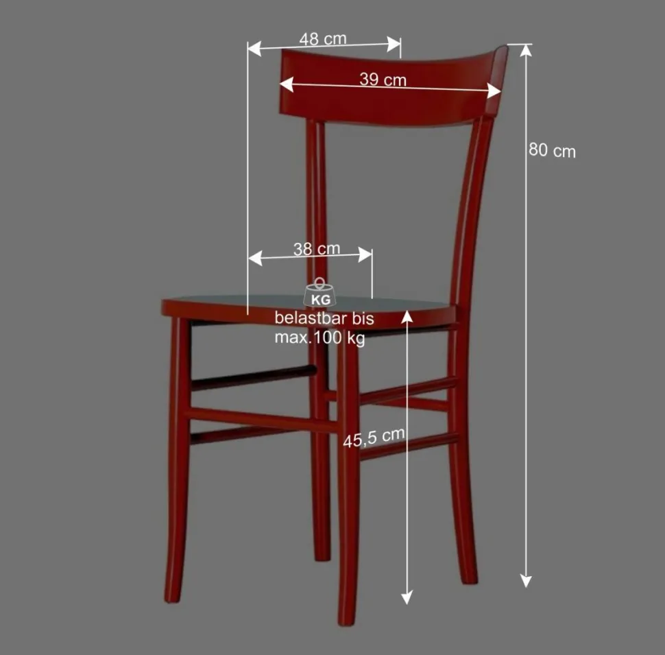 Die ziegelrote Lackierung auf der gesamten Oberfläche des Stuhls ist nicht nur optisch ansprechend, sondern auch äußerst pflegeleicht. Sie schützt das Holz vor Feuchtigkeit und Kratzern, sodass der Stuhl auch nach vielen Jahren noch wie neu aussieht. Die sorgfältige Lackierung bringt den natürlichen Charme des Holzes besonders gut zur Geltung und macht den Stuhl zum Design-Highlight in jedem Raum.