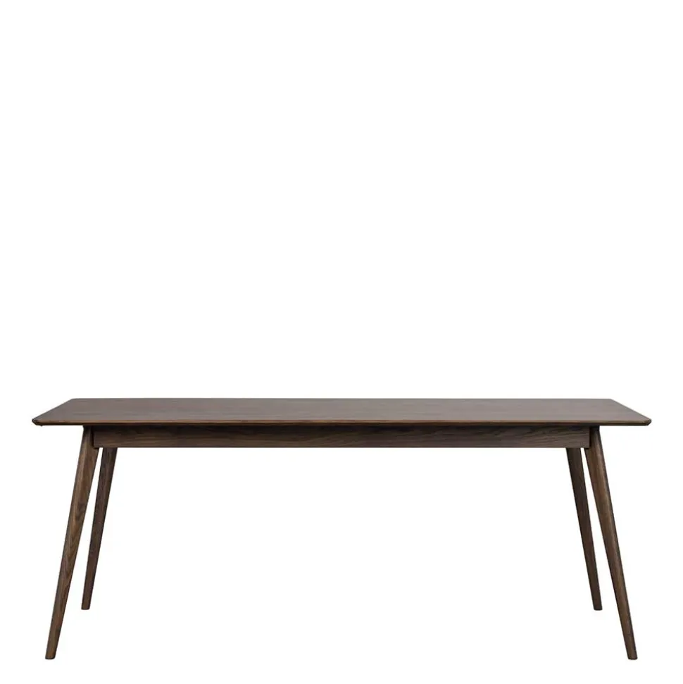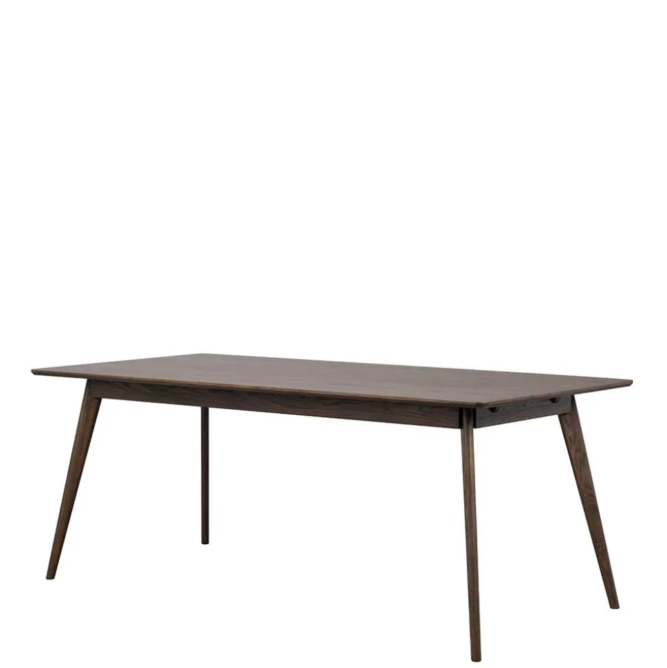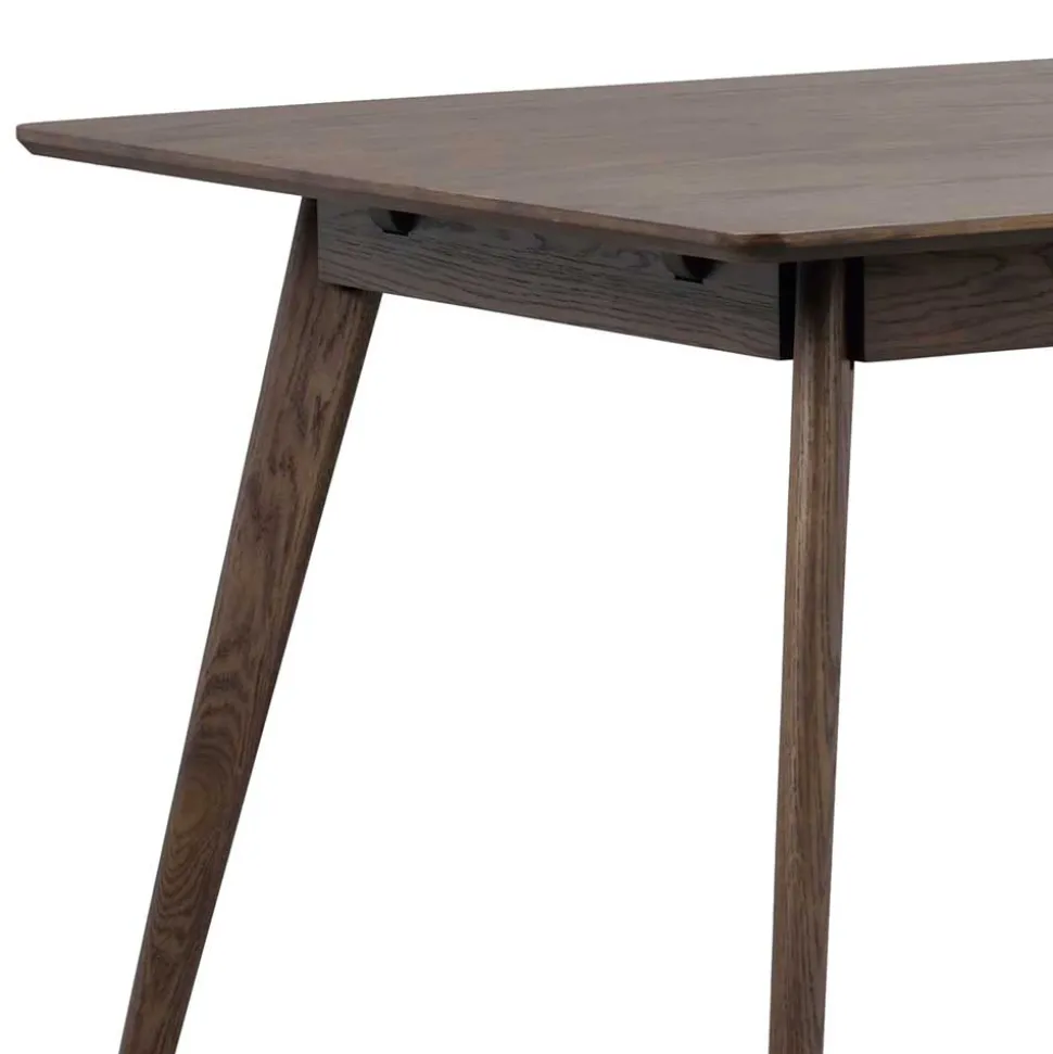 Die dunkelbraun lackierte Oberfläche des Esstisches „Bilbaos“ hebt die natürliche Holzmaserung hervor und verleiht dem Tisch eine edle Optik. Diese Lackierung schützt nicht nur das Holz vor äußeren Einflüssen, sondern lässt auch die Schönheit der Eiche durchscheinen, wodurch ein eleganter und zeitloser Look entsteht.
