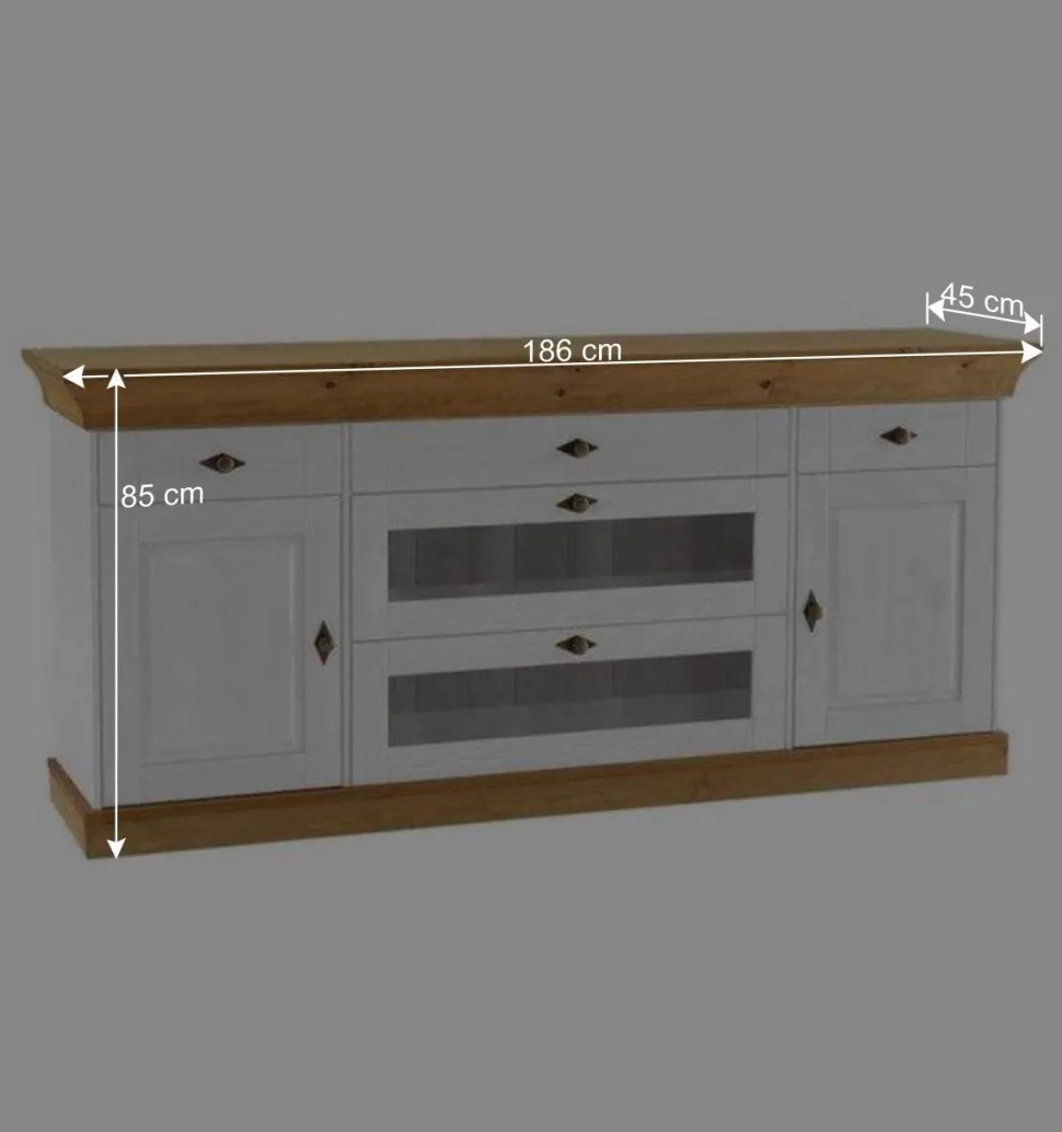 Mit einer Breite von 186 cm, einer Höhe von 85 cm und einer Tiefe von 45 cm bietet das Sideboard „Sibiuta“ großzügigen Stauraum. Zwei Türen, veredelt mit edlen Metallbeschlägen, verbergen jeweils einen Einlegeboden. Hier lassen sich Geschirr, Bücher oder persönliche Schätze optimal verstauen. Die zwei Schubladen mit Glaseinsatz und die drei weiteren aus Holz sind mit einem hochwertigen Metallauszug ausgestattet. Dies gewährleistet ein sanftes und sicheres Öffnen sowie Schließen. Abgerundet wird das stimmige Design durch handliche Metallknöpfe, die sowohl an den Schubladen als auch an den Türen angebracht sind.