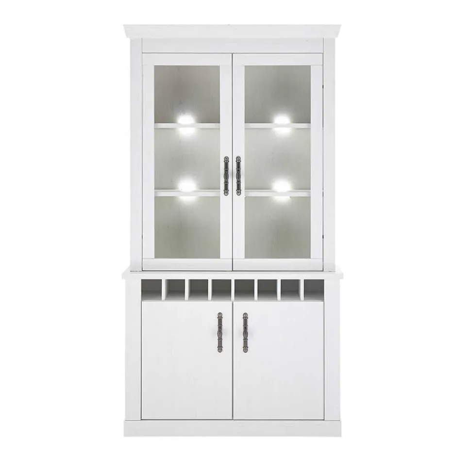 – Buffetschrank Vitrine: Mit den Maßen 110x207x44 cm bietet sie reichlich Stauraum. Der obere Aufsatz verfügt über zwei Glasrahmentüren mit je zwei dahinterliegenden Böden – ideal zur stilvollen Präsentation von Geschirr oder Dekoration. Unten befinden sich zwei Türen mit zusätzlichen Böden sowie eine praktische Einteilung für acht Flaschen. Die Tiefe des Aufsatzes beträgt ca. 34,4 cm.