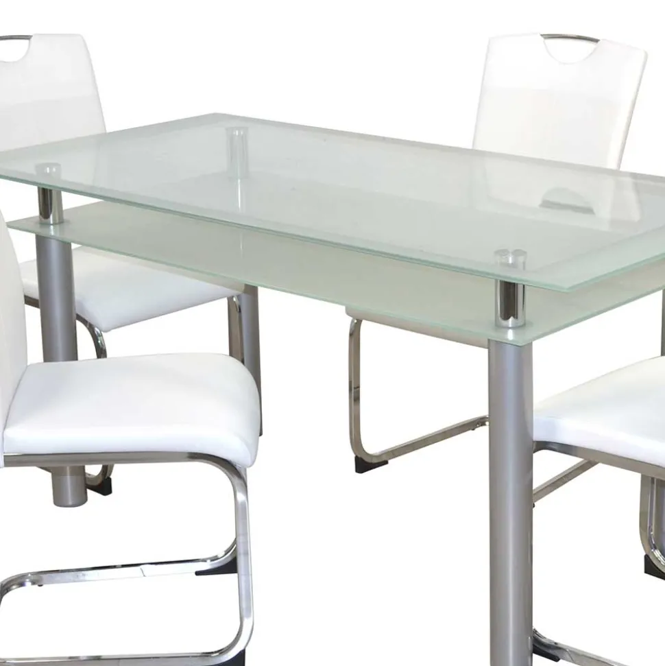Mehr als nur ein schöner Anblick – der Tisch dieser Sitzgruppe überzeugt auch mit funktionalem Mehrwert. Die obere Tischplatte kombiniert klares Sicherheitsglas mit einem matten Rand in Milchglas-Optik. Diese Kombination bringt Struktur in das Design und sorgt gleichzeitig für einen hochwertigen Look. Eine zusätzliche Ablageplatte aus Milchglas unterhalb der Tischplatte bietet praktischen Stauraum für Utensilien, die schnell zur Hand sein sollen – von Servietten bis hin zu Zeitschriften. Mit einer Belastbarkeit von bis zu 15 kg ist der Tisch nicht nur schön, sondern auch stabil.