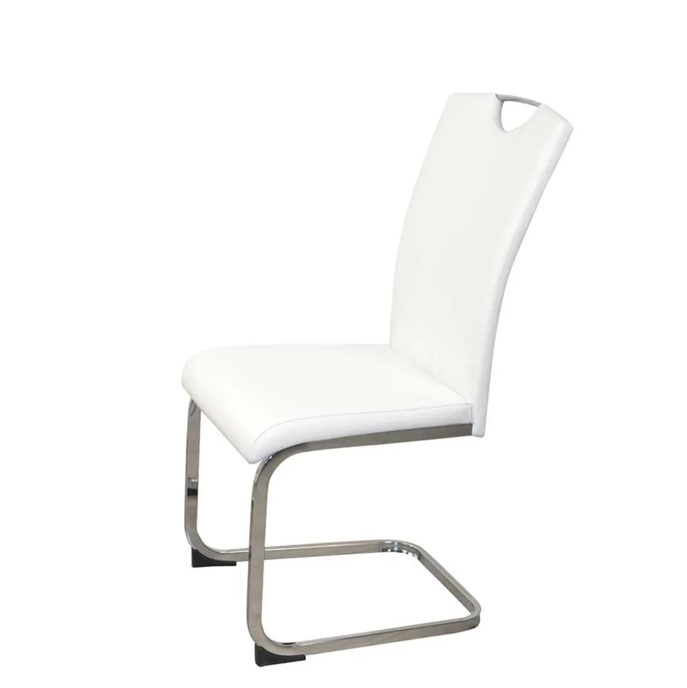 Die Stühle sind mit Kunstleder in strahlendem Weiß bezogen, gefertigt aus 100 % Polyurethan. Dieser moderne Werkstoff ist ein echtes Multitalent: Besonders pflegeleicht, widerstandsfähig gegenüber Feuchtigkeit und Abnutzung – und gleichzeitig angenehm weich auf der Haut. Das Kunstleder sieht echtem Leder zum Verwechseln ähnlich, ist dabei aber tierfreundlich und unkompliziert in der Reinigung. Die Gestelle aus Metall sorgen für die nötige Stabilität und Langlebigkeit – perfekt für den täglichen Gebrauch.