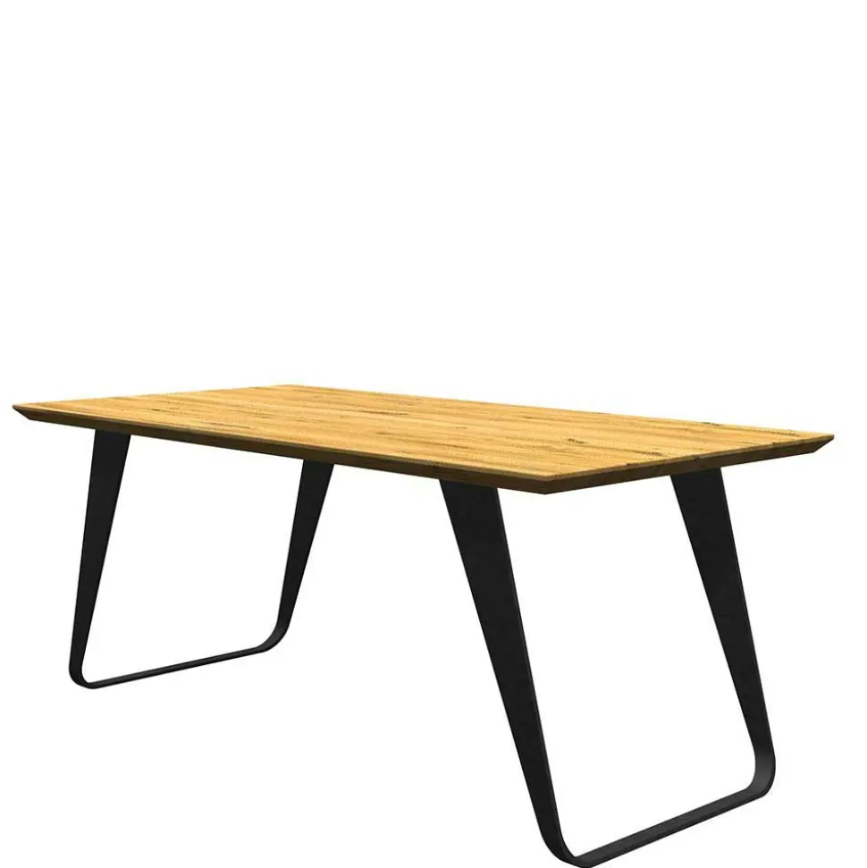 Massives Eichenholz kommt für die Herstellung der etwa 4 cm starken Platte des Esszimmertisches Lash zum Einsatz. Die Oberflächen des Massivholzes sind im Naturton geölt, wodurch die ausdrucksstarke Maserung der Eiche besonders gut zur Geltung kommt. Zur Verfeinerung des Erscheinungsbildes ist die Tischplatte mit Schweizer Kanten versehen.