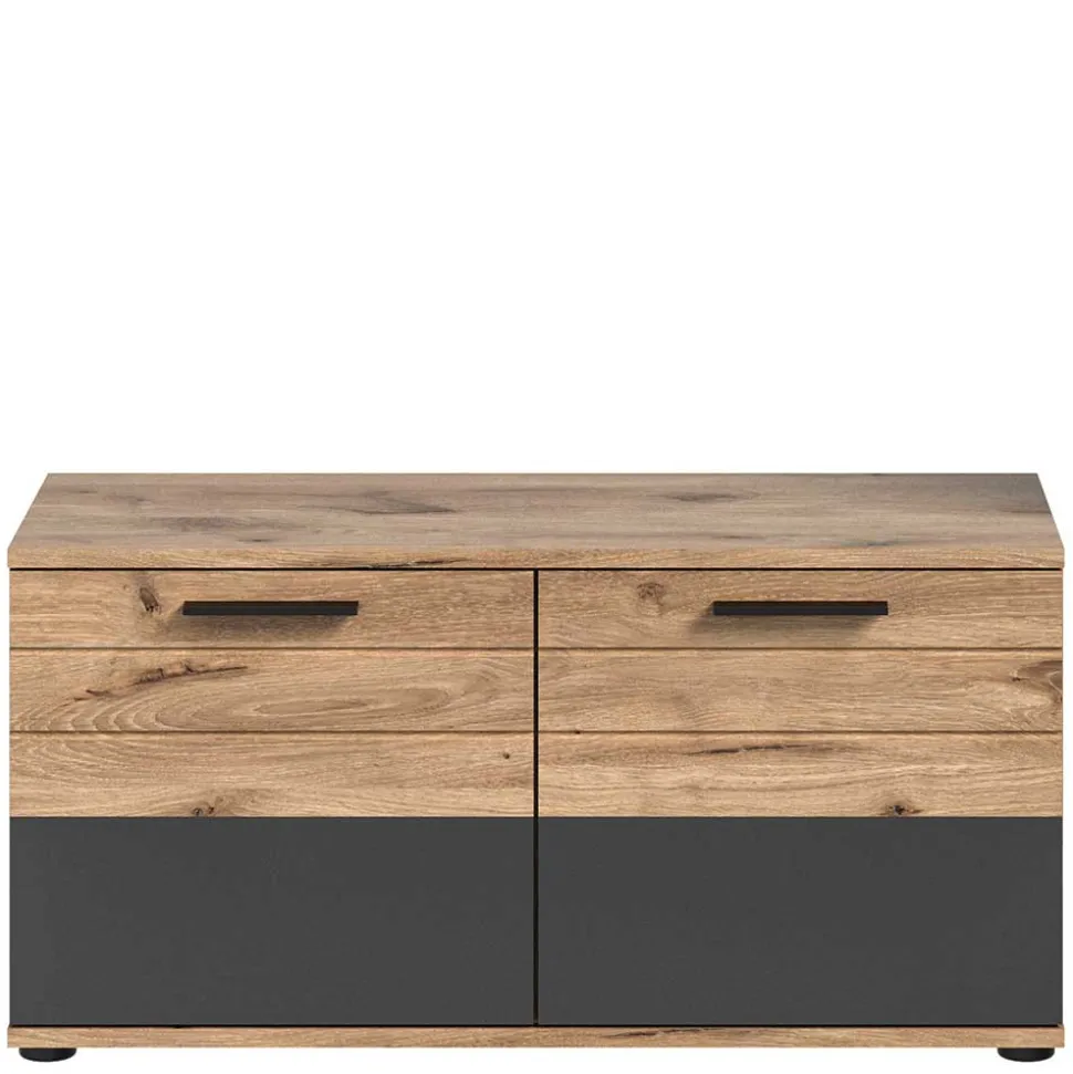 - Oberflächen pflegeleicht in Holzoptik Wildeiche und Grau beschichtet, Front mit wirkungsvoller Rillenfräsung, Kanten tiefgezogen