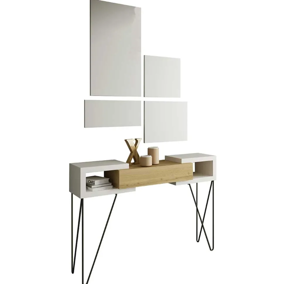- Melaminbeschichtete Oberfläche in Holzoptik Weiß und Holzoptik Wildeiche, Metall schwarz lackiert