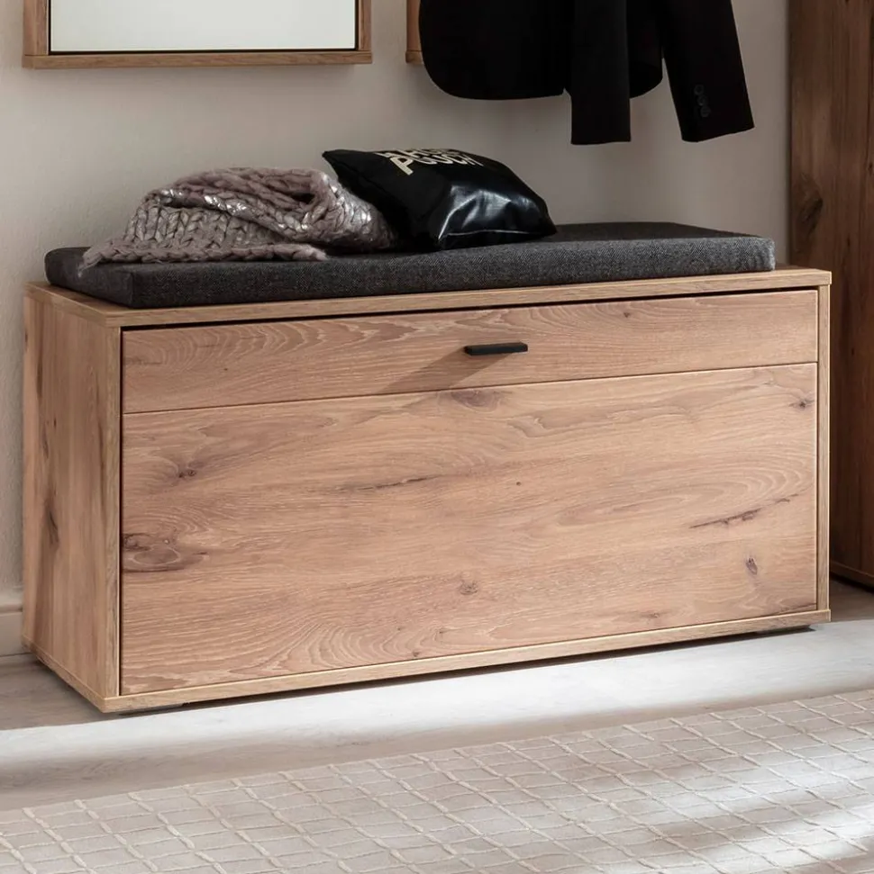 Ein durchdachtes Design in ansprechender Wildeiche Optik: Die Garderobenbank „Vapposia“ vereint Funktionalität und Ästhetik zu einem perfekten Möbelstück für Ihren Eingangsbereich. Mit ihrer eleganten Holzoptik fügt sie sich harmonisch in verschiedene Wohnstile ein und bietet gleichzeitig praktischen Stauraum für Schuhe und Accessoires.