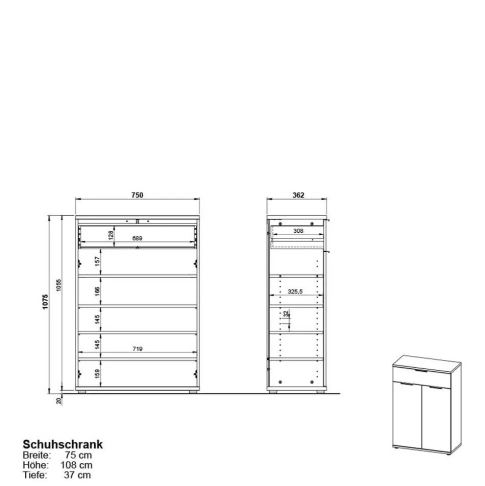 Der Schuhschrank bietet mit seinen Maßen von 75 cm Breite, 108 cm Höhe und 37 cm Tiefe viel Stauraum für bis zu 15 Paar Schuhe. Dank eines festen Fachbodens und drei verstellbarer Einlegeböden lässt sich der Innenraum optimal auf Ihre Bedürfnisse anpassen. Eine geräumige Schublade mit Metallauszug ergänzt das Stauraumangebot, während die Deckplatte mit bis zu 30 kg belastbar ist – ideal, um Dekorationen oder Accessoires stilvoll zu platzieren. Die zwei Garderobenpaneele bieten mit einer Breite von 15 cm und einer Höhe von 170 cm genügend Platz, um Jacken und Mäntel übersichtlich zu verstauen. Die einklappbaren Haken sind platzsparend und elegant zugleich.