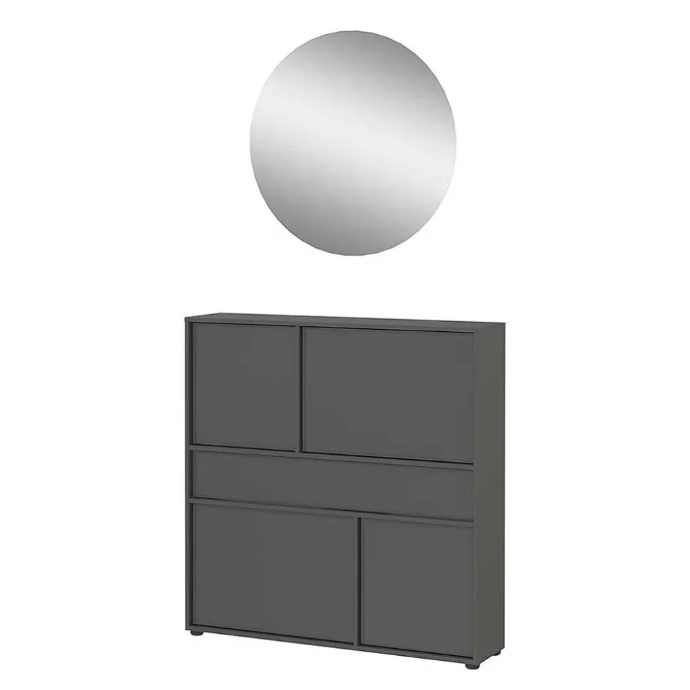 Mit dem Flurkommode & Spiegel Set „Flemingo“ verleihen Sie Ihrem Eingangsbereich eine klare, stilbewusste Struktur. Die edle Farbgebung in Dunkelgrau unterstreicht die moderne Formsprache und sorgt für eine ruhige, aufgeräumte Atmosphäre. Die Kombination aus großzügigem Stauraum und einem dekorativen Spiegel schafft ein harmonisches Gesamtbild, das Funktionalität und Ästhetik vereint. Gefertigt in Deutschland, überzeugt das zweiteilige Set durch hochwertige Materialien und eine exzellente Verarbeitung – ideal für alle, die Wert auf Qualität und Design legen.