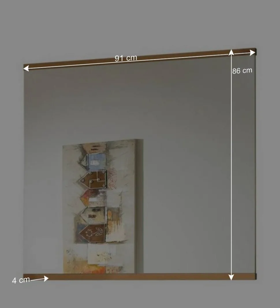 Mit den Maßen 91 cm Breite, 86 cm Höhe und 4 cm Tiefe ist der Spiegel ideal dimensioniert. Die sichtbaren Holzleisten oben und unten rahmen den Spiegel perfekt ein und verleihen ihm eine strukturelle Präsenz.