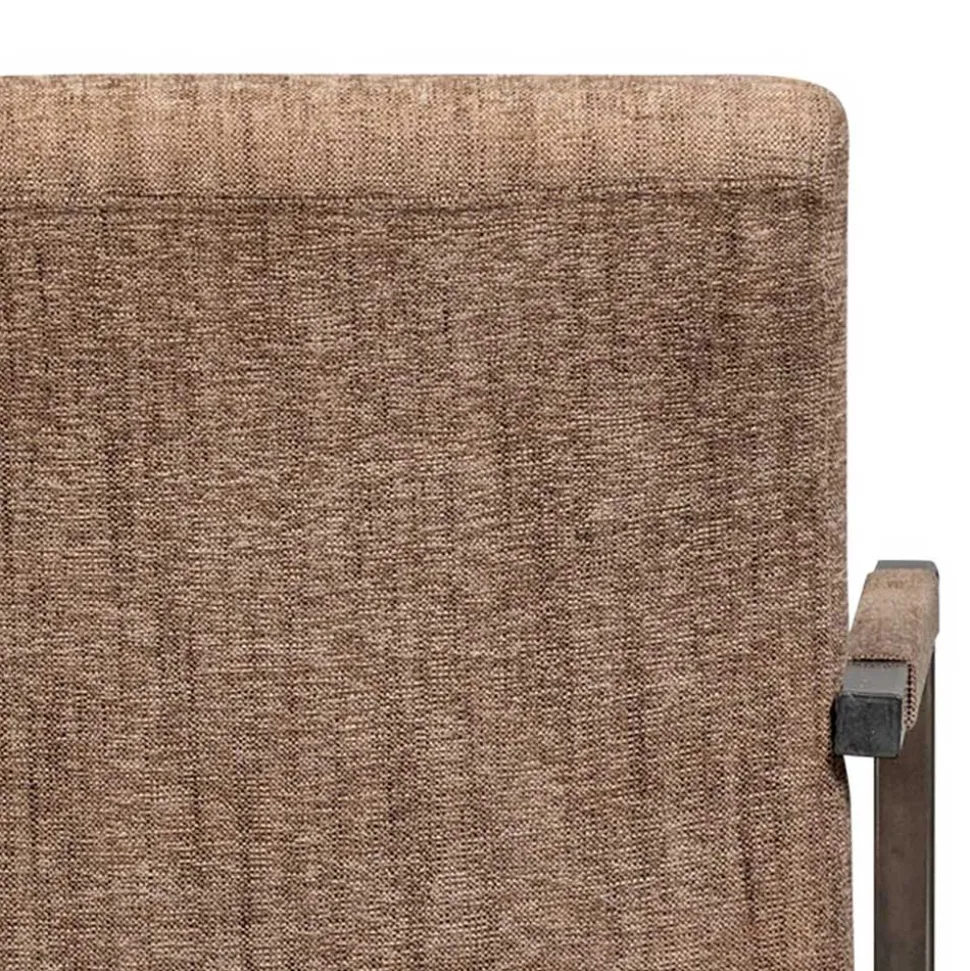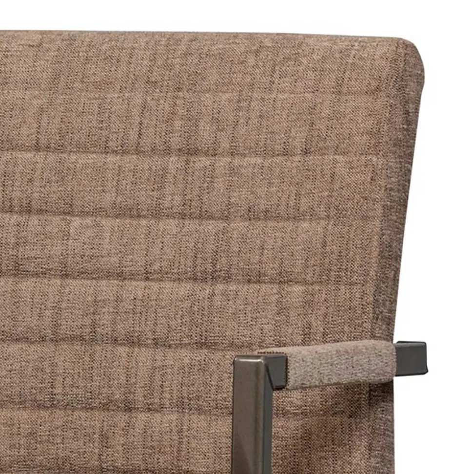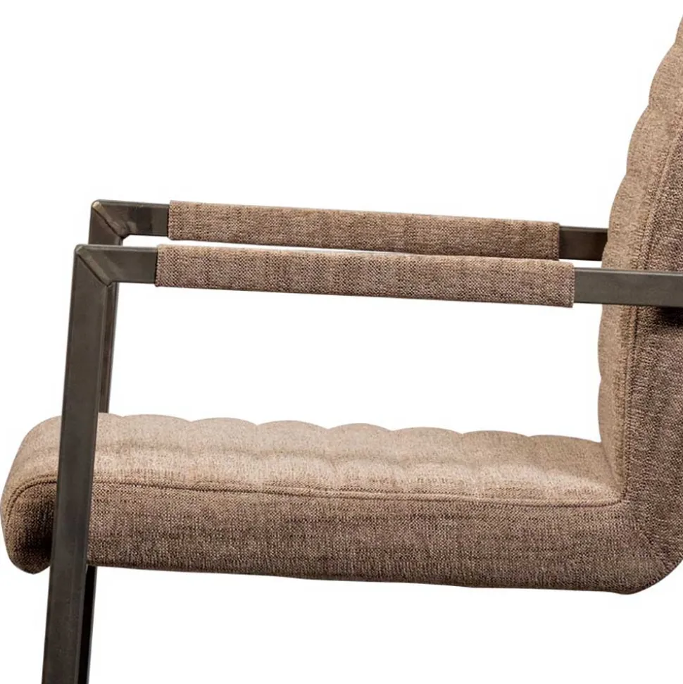 Der Sitz und die Rückenlehne sind mit einem robusten Webstoff bezogen, der aus 94 % Polyester und 6 % Nylon besteht. Dieses Material zeichnet sich durch eine hohe Strapazierfähigkeit aus und bleibt auch bei täglichem Gebrauch in Topform. Die angenehm weiche Schaumstoffpolsterung sorgt für besten Sitzkomfort, während die leicht nach hinten geneigte Rückenlehne eine ergonomische Sitzhaltung unterstützt. Abgerundet wird das Design durch kantige Metallarmlehnen, die für zusätzlichen Komfort mit Stoff bezogen sind.