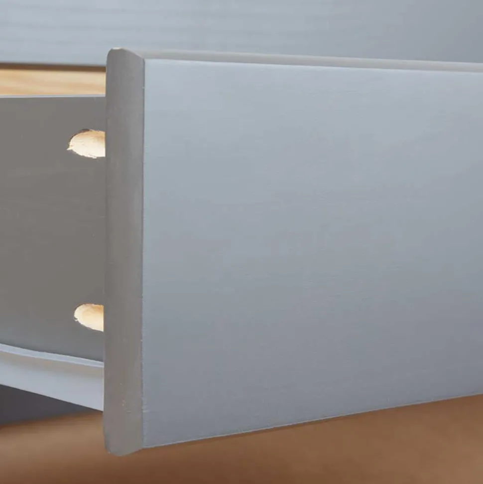 Das Bett ist aus hochwertigem massivem Kiefernholz gefertigt, das für Stabilität und Langlebigkeit steht. Die leicht gerundeten Kopf- und Fußteile verleihen dem Bett eine elegante Note, während die dekorativen Fräsungen für das gewisse Extra sorgen. Ein stabiles Wangengestell und die grau lackierte Oberfläche komplettieren das hochwertige Erscheinungsbild.