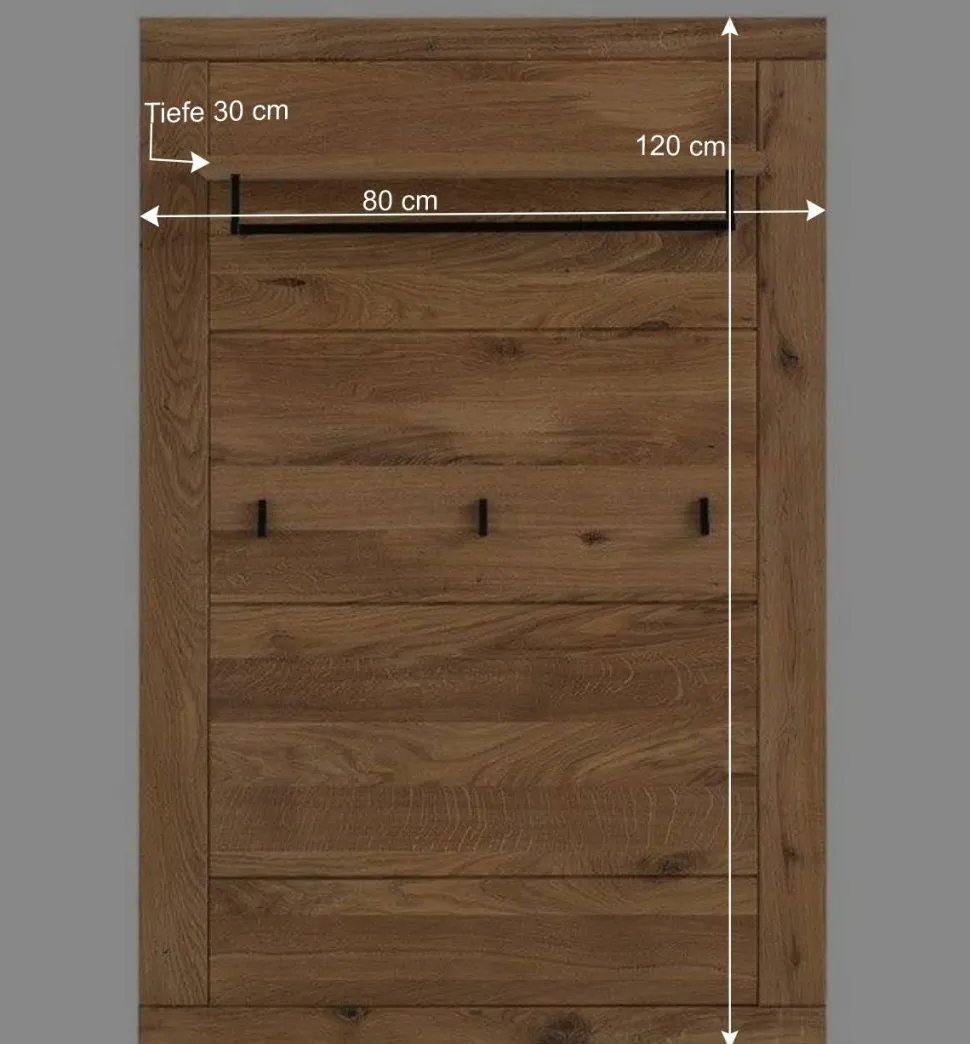 Mit den Abmessungen von 80 cm Breite, 120 cm Höhe und 30 cm Tiefe, fügt sich „Sennya“ harmonisch in jeden Raum ein. Trotz seiner kompakten Maße bietet es genügend Platz für alle Ihre Jacken, Mäntel und Accessoires. Die teilmassive Rückwand gewährleistet zusätzliche Stabilität und unterstreicht den hochwertigen Charakter des Möbelstücks.