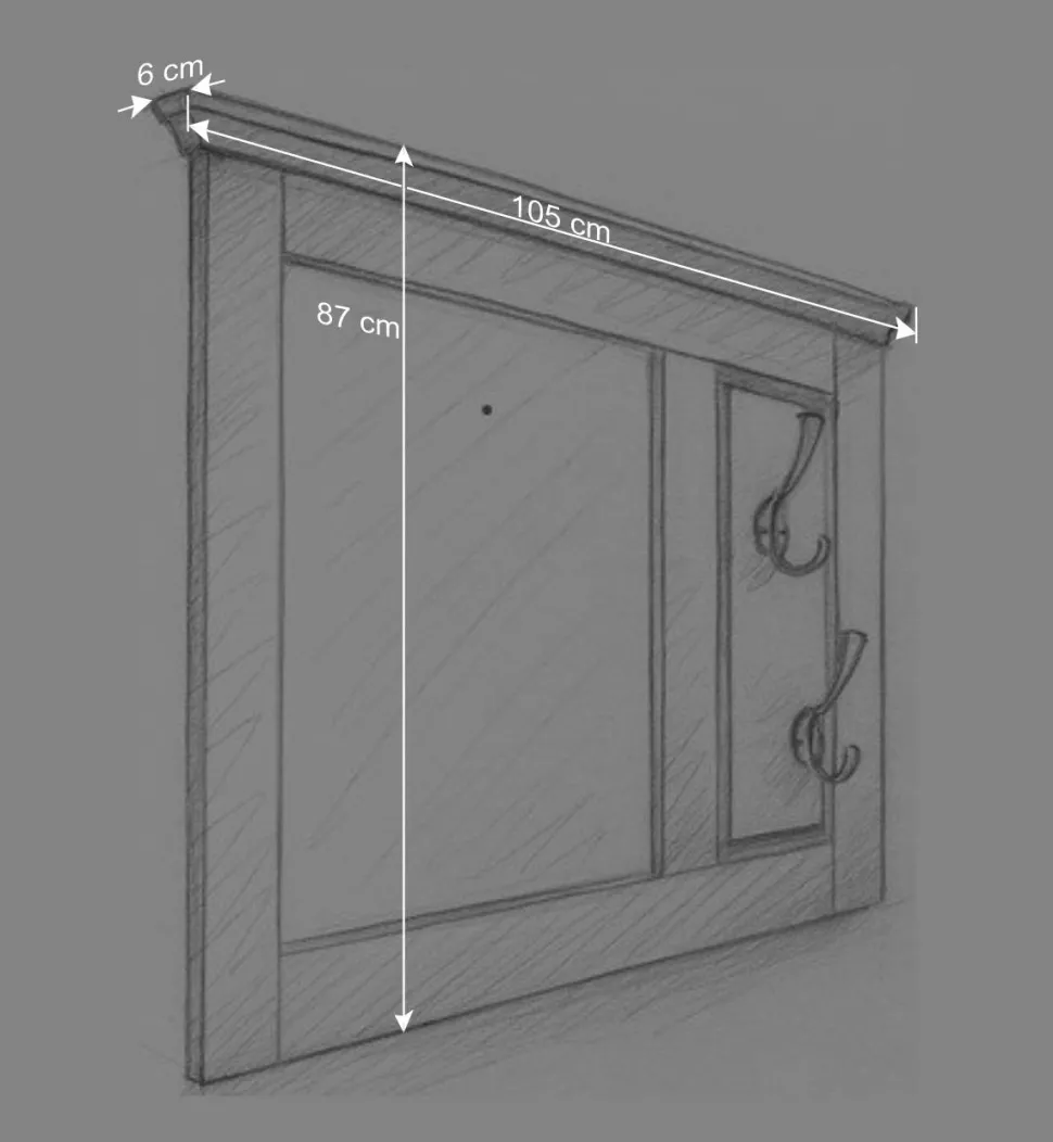 Mit seinen großzügigen Maßen von 105 cm Breite, 87 cm Höhe und 6 cm Tiefe bietet dieser Spiegel nicht nur einen großzügigen Blick beim letzten Check vor dem Verlassen des Hauses, sondern auch smarte Funktionalität. Der breite Rahmen ist mit dekorativen Fräsungen veredelt, die den Landhauscharme nochmals unterstreichen. Zwei seitlich angebrachte Doppelkleiderhaken aus Metall sorgen für praktischen Stauraum – ideal für Jacken, Taschen oder Schals. Der links integrierte, rechteckige Spiegel sorgt für optimale Lichtreflexion und Tiefe im Raum.
