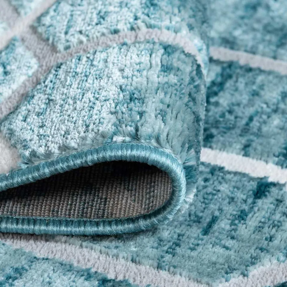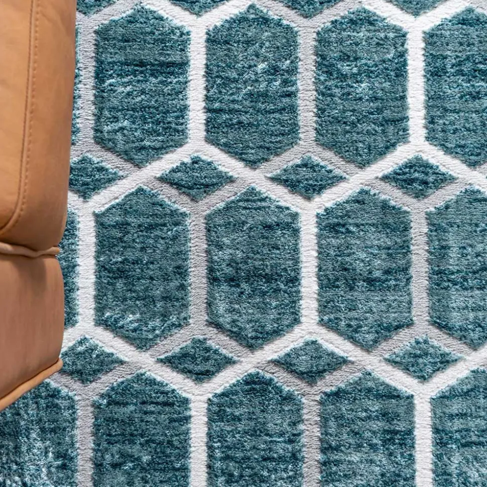 Der geometrisch gemusterte Teppich „Calencio“ überzeugt durch seine ausdrucksstarke Farbgebung in Blau und Cremeweiß. Das vollflächige Wabendesign ist nicht nur dekorativ, sondern auch raffiniert gestaltet: Zwei identische Muster überlagern sich versetzt und erzeugen eine faszinierende optische Tiefe. So entsteht ein lebendiger, aber dennoch harmonischer Gesamteindruck – ideal für moderne Wohnräume, die Struktur und Stil vereinen möchten.