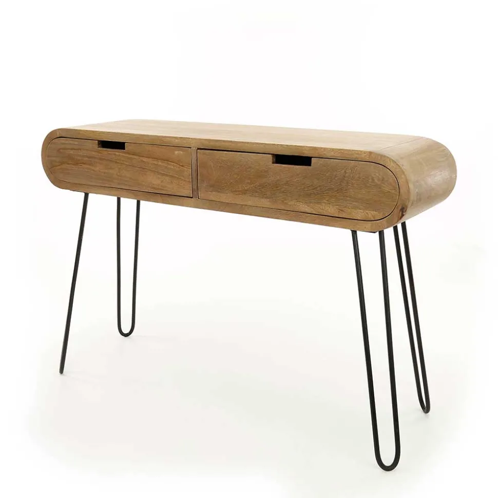Neben seinem ästhetischen Reiz bietet Vioriga praktischen Stauraum. Zwei Schubladen mit robustem Holzauszug bieten Platz für Accessoires, Schmink- oder Schreibutensilien, wobei die kantigen Grifflöcher eine einfache Handhabung gewährleisten.